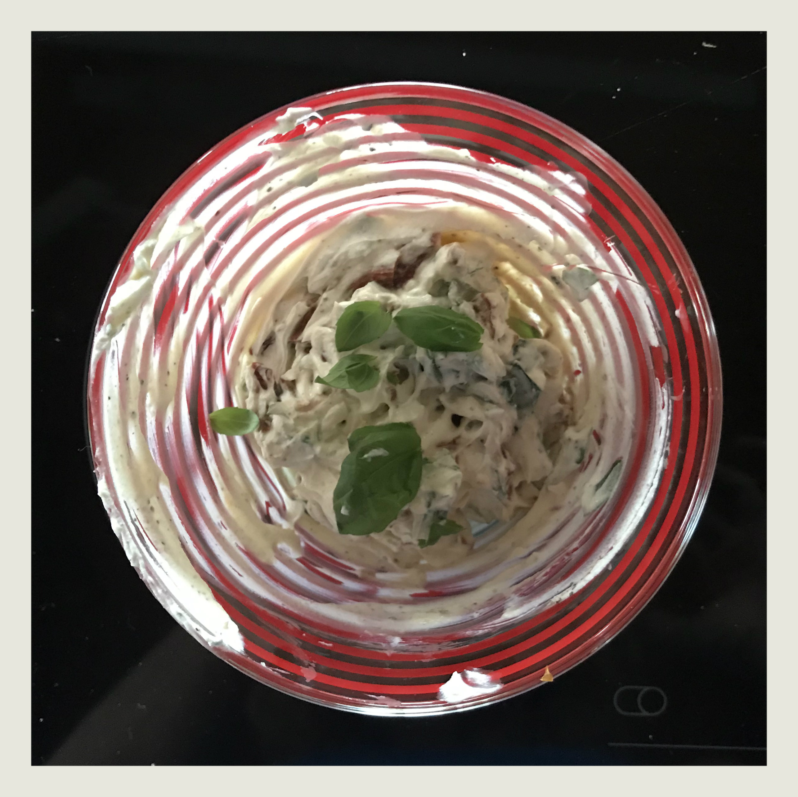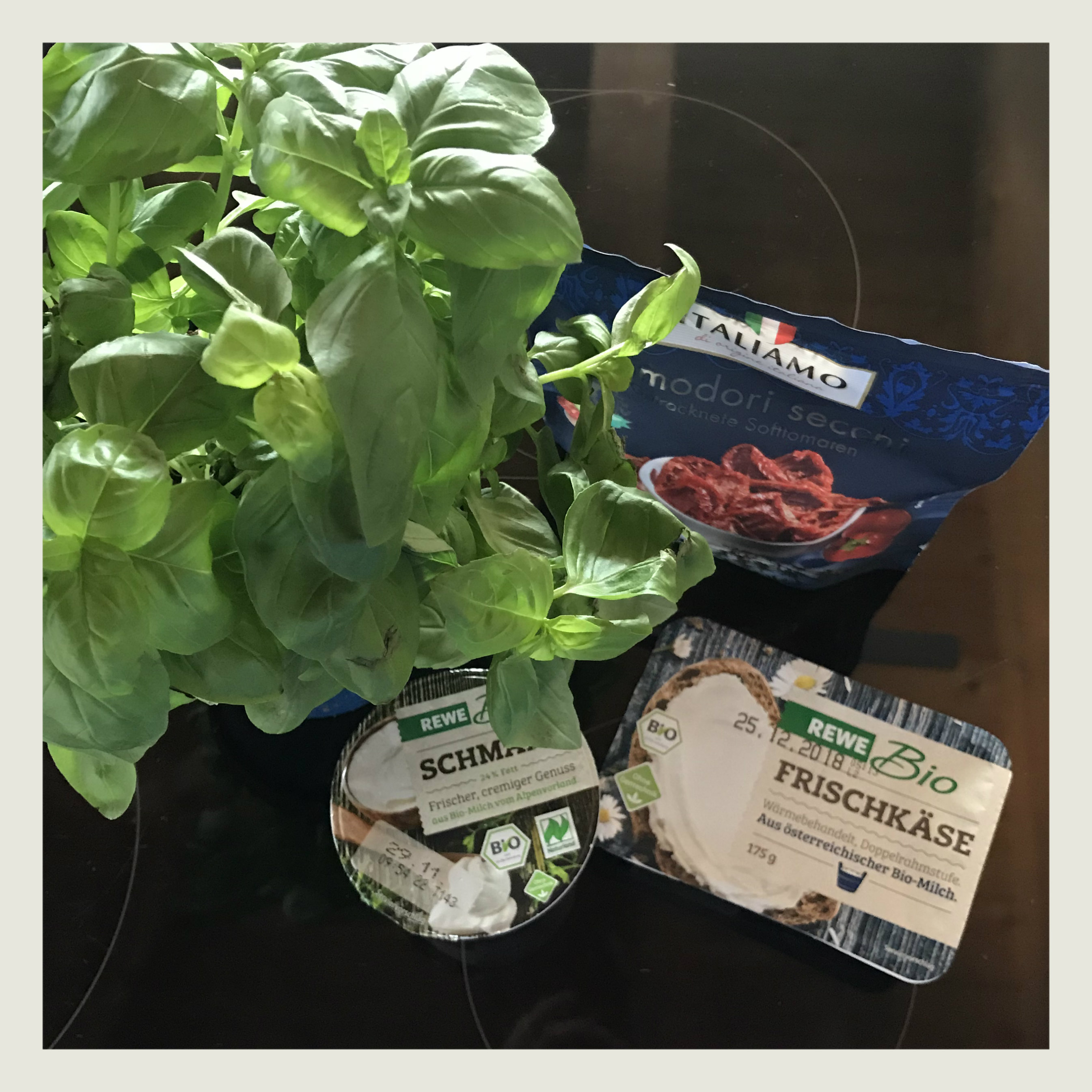 verrühren, getr. Tomaten und Basilikum unterrühren und mit