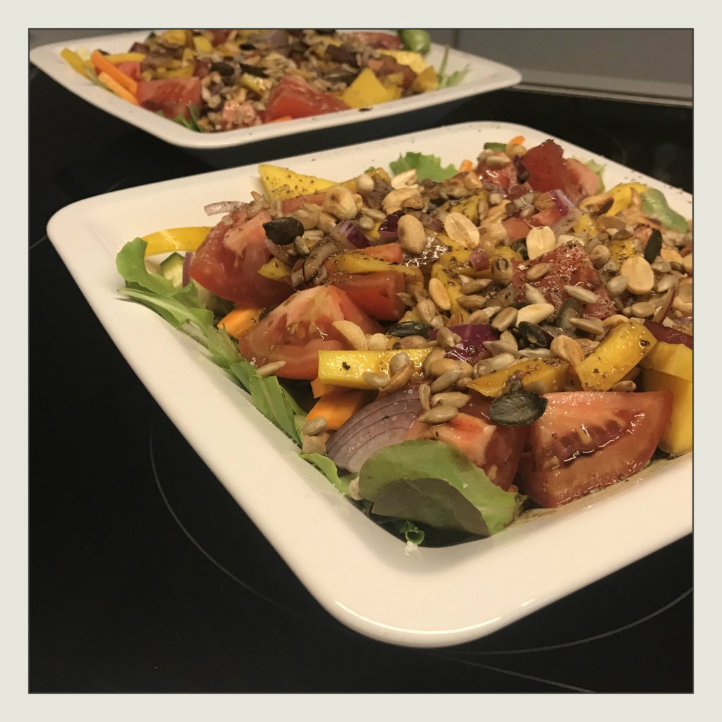 3 EL Balsamicoessig mischen, dann die Salatkerne auf den Salatportionen verteilen