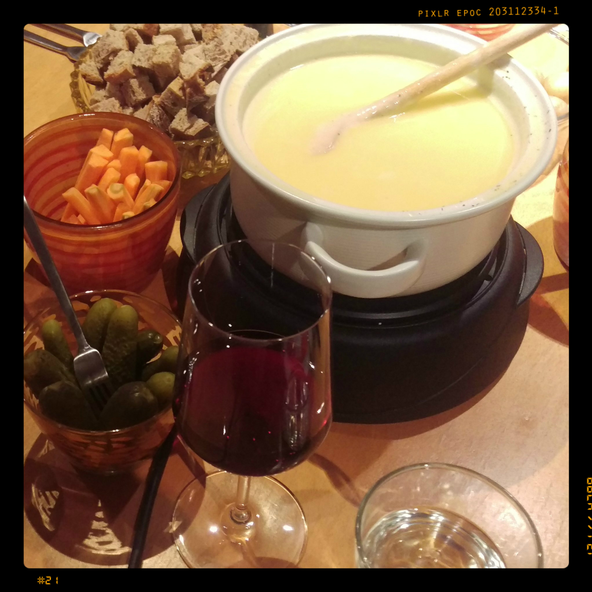 Achtung: keine kohlensäurehaltige Getränke zum Käsefondue, das bekommt dem Magen nicht so gut; heißer Tee und Kirschwasser dazu, ist nicht meine Sache, ich bevorzuge Rotwein und stilles Wasser