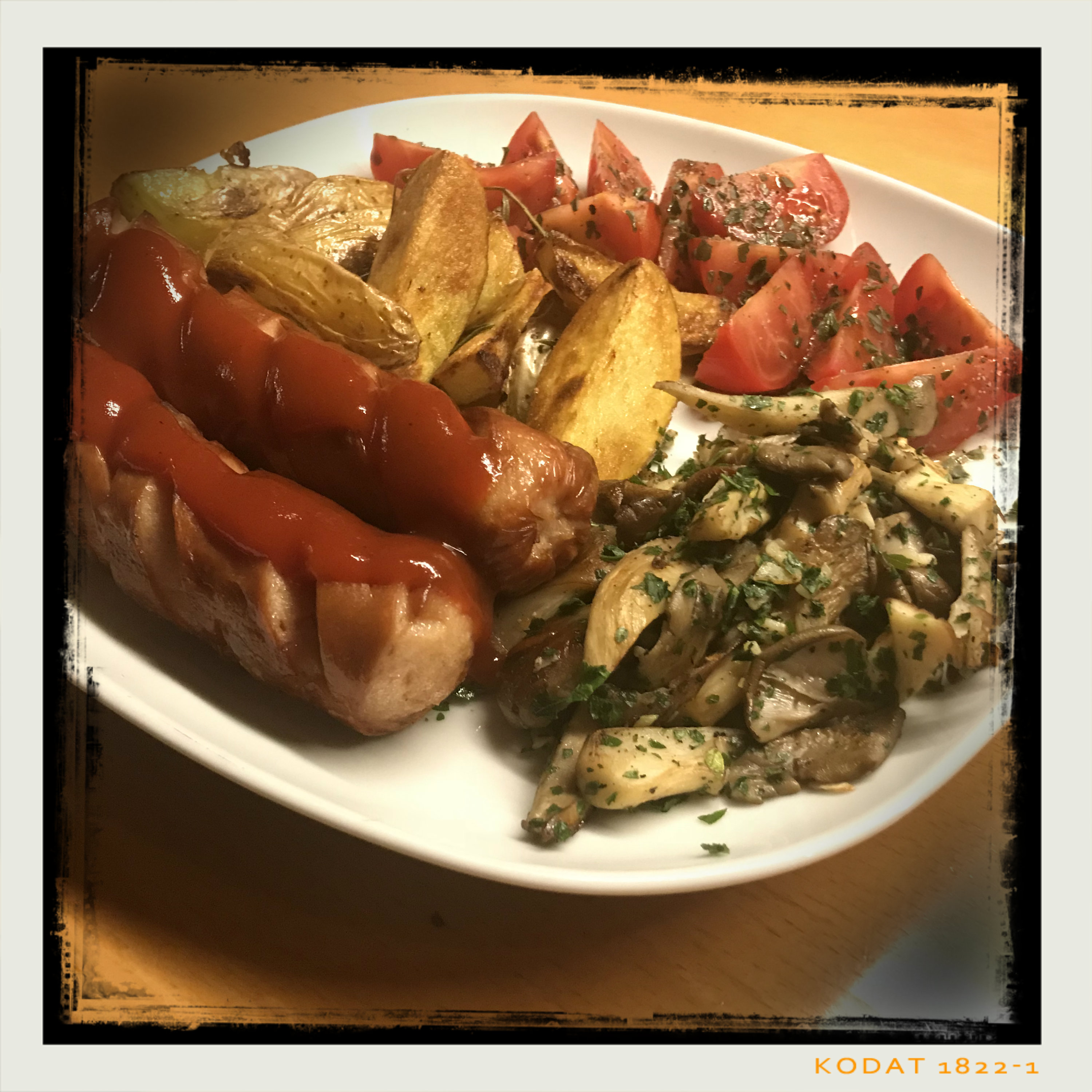 die Currywürste mit den Austernpilzen und Röstkartoffeln zu den Tomaten auf die Teller geben und mit