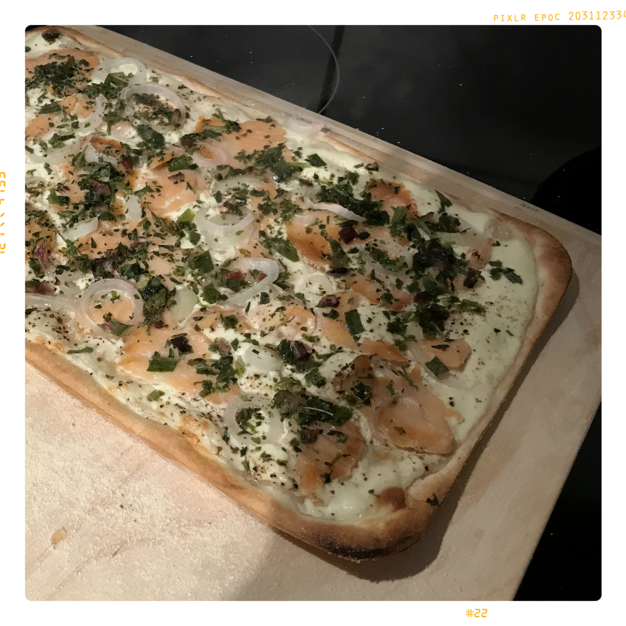 den Flammkuchen auf den Stein gleiten lassen und ca. 5 1/2 Min. bei 250 Grad (alternativ auf Backpapier ca. 10 Min.) backen