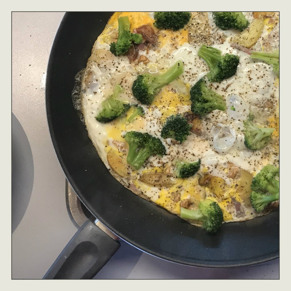 frisch gemahlenem schwarzen Pfeffer würzen und mit den Brokkoli belegen, unter dem Deckel in ein paar Minuten garen, bis die Eier gestockt sind