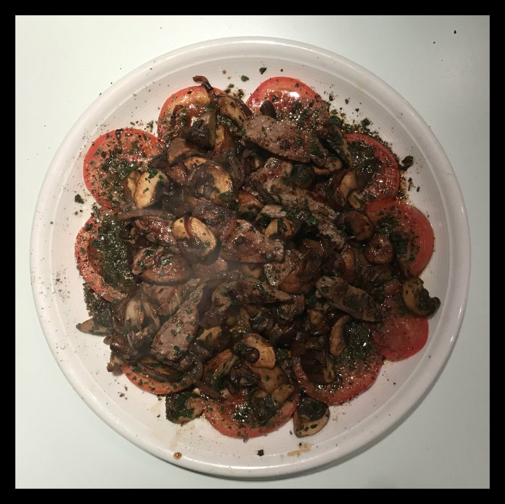 1 Knoblauchzehe (fein gehackt) kurz mitbraten, dann die Steakstreifen hinzugeben und alles noch einmal kurz braten, alles mit
