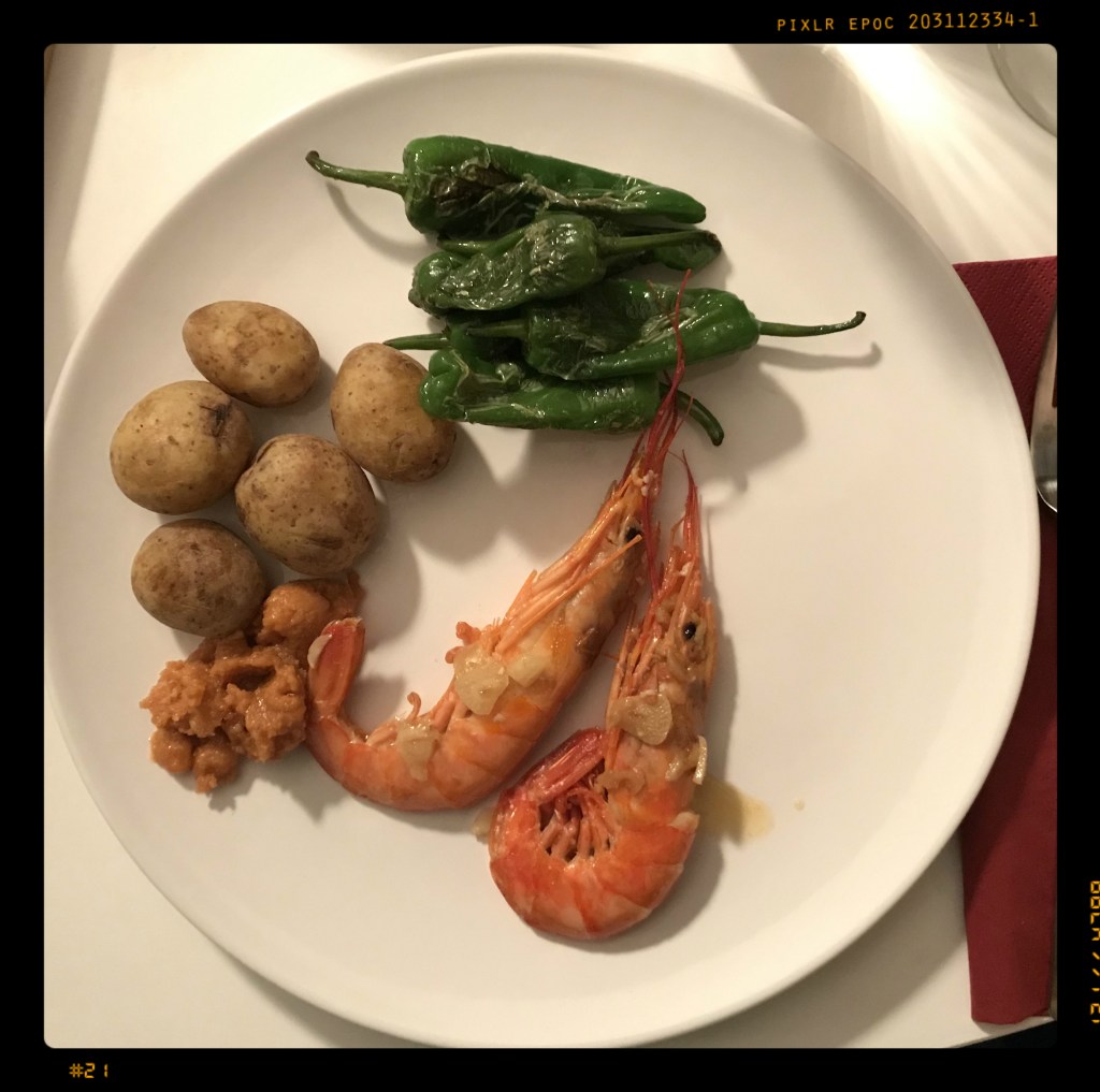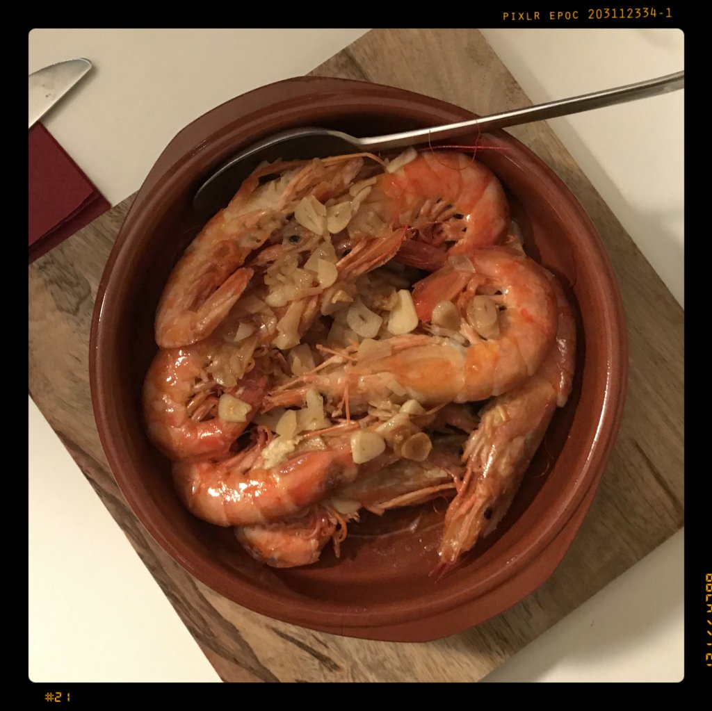 die Garnelen in eine gut erhitzte Tonform (oder andere Schüssel) füllen und z. B. mit dem Feldsalat mit Tomaten und Paprika (vom 17. Juli 2018) servieren, dazu vielleicht noch etwas Bauernbaguette