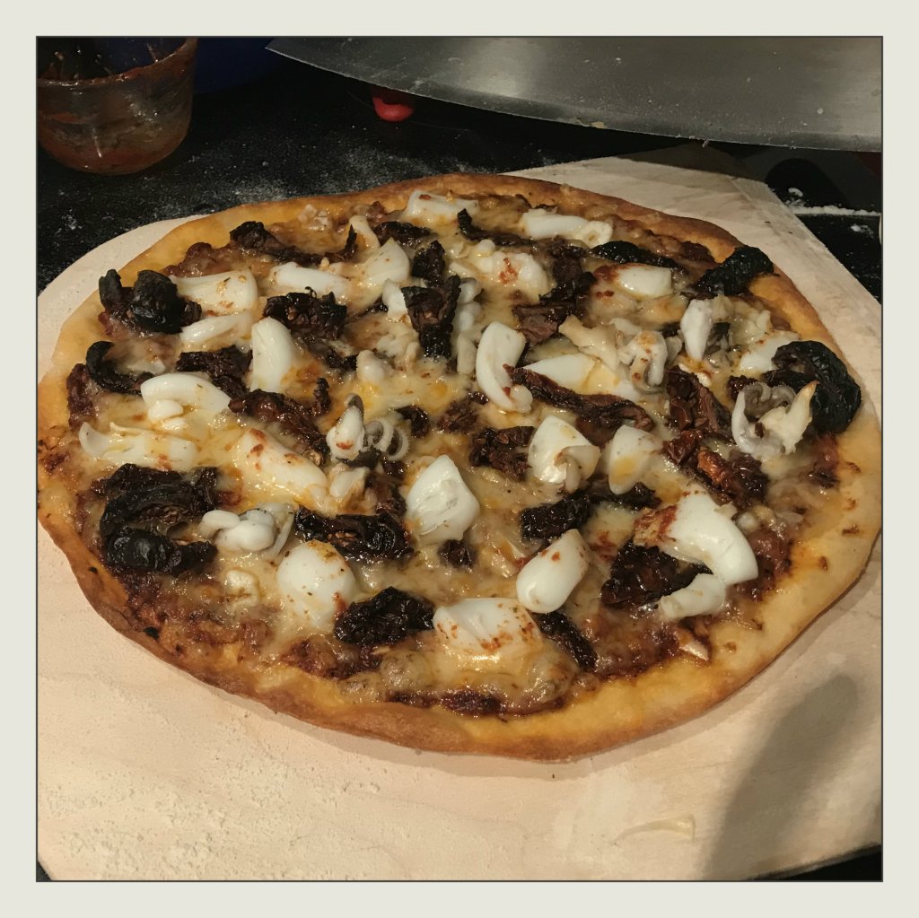 bemehlten Pizzaschieber gleichmäßig dünn ausrollen, mit der Tomatensauce bestreichen, zuerst den Käse darauf verteilen, dann mit dem Tintenfisch und den getr. Tomaten belegen, mit