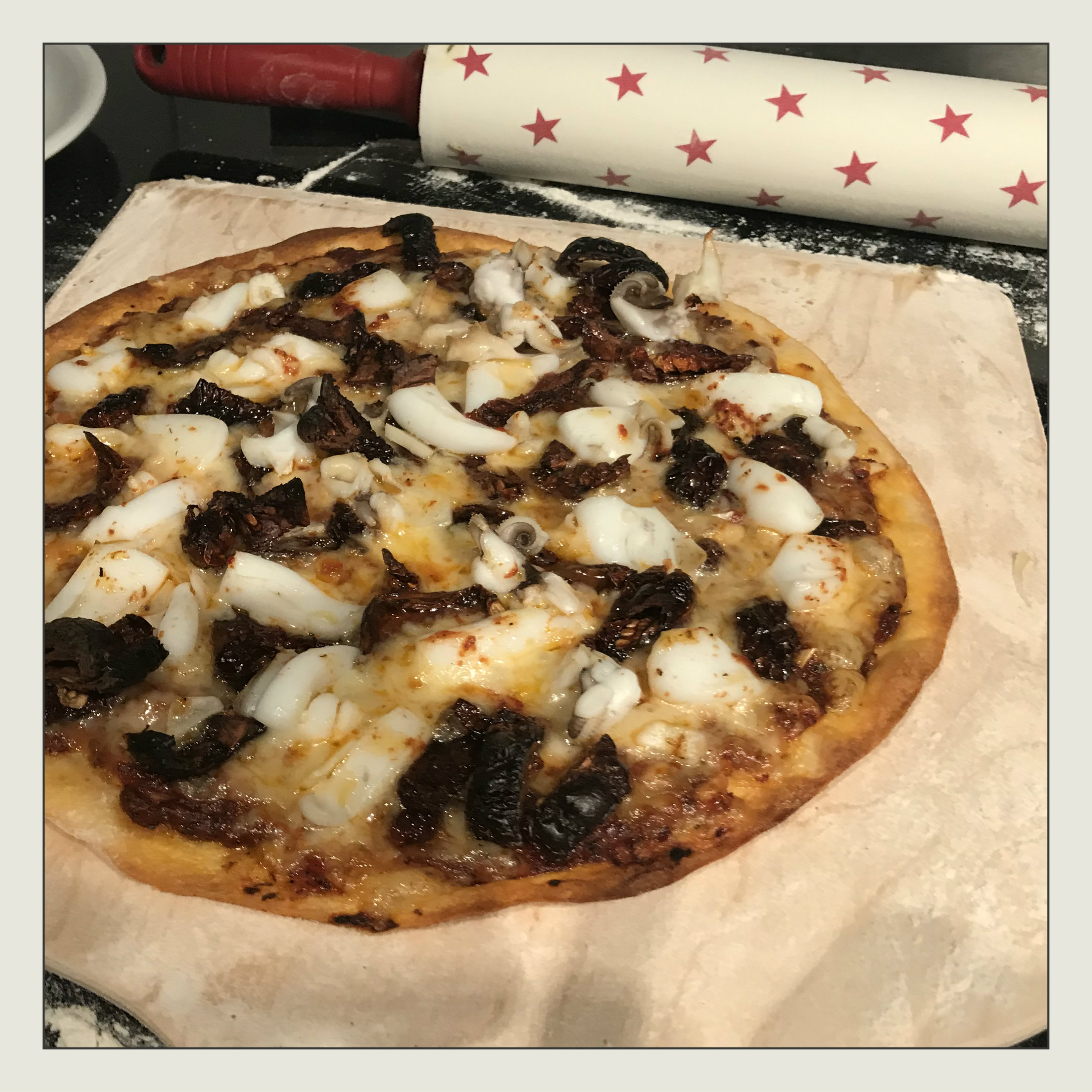 bemehlten Pizzaschieber gleichmäßig dünn ausrollen, mit der Tomatensauce bestreichen, zuerst den Käse darauf verteilen, dann mit dem Tintenfisch und den getr. Tomaten belegen, mit