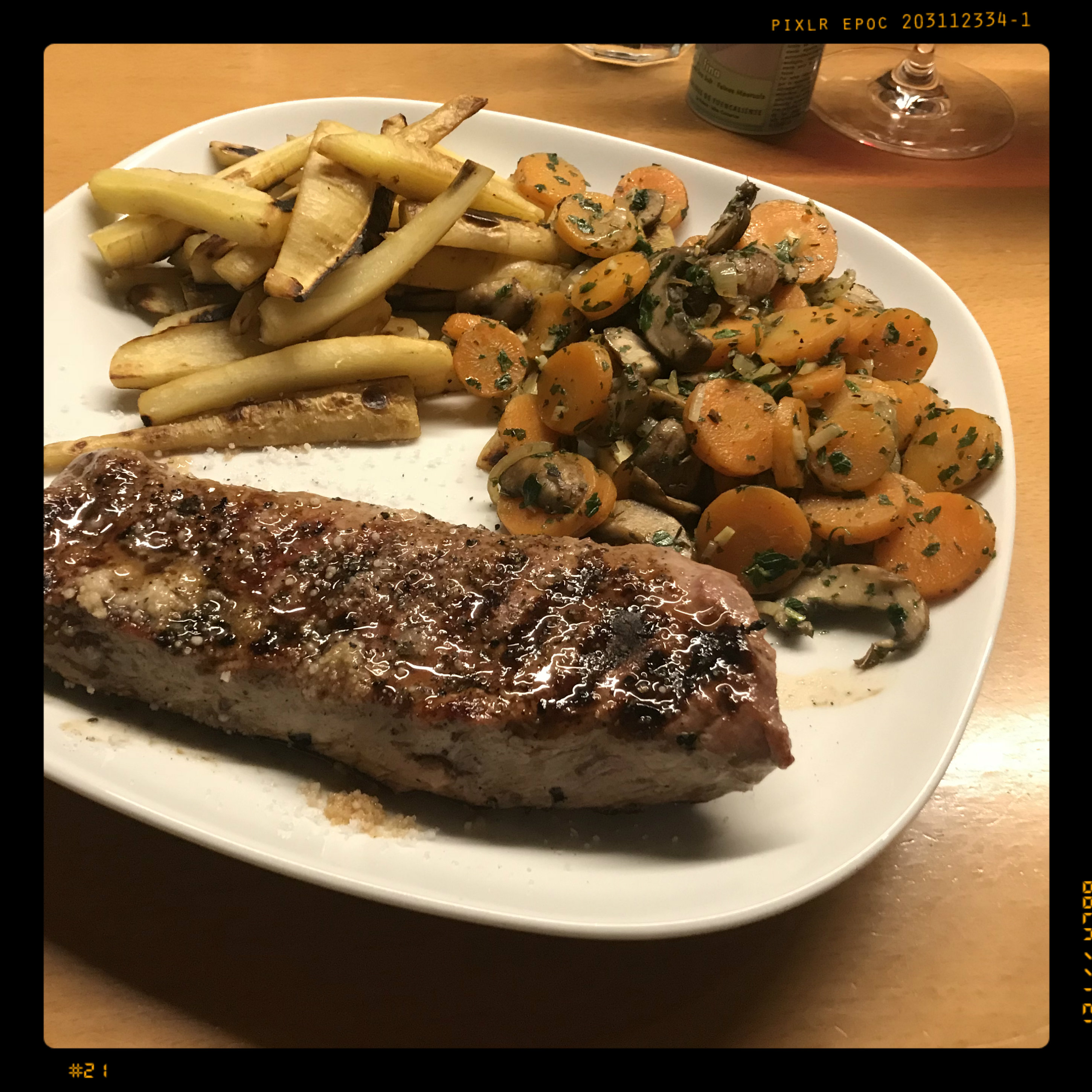 frisch gemahlenem schwarzen Pfeffer würzen und mit den Pastinaken und dem Möhrengemüse auf vorgewärmte Teller geben