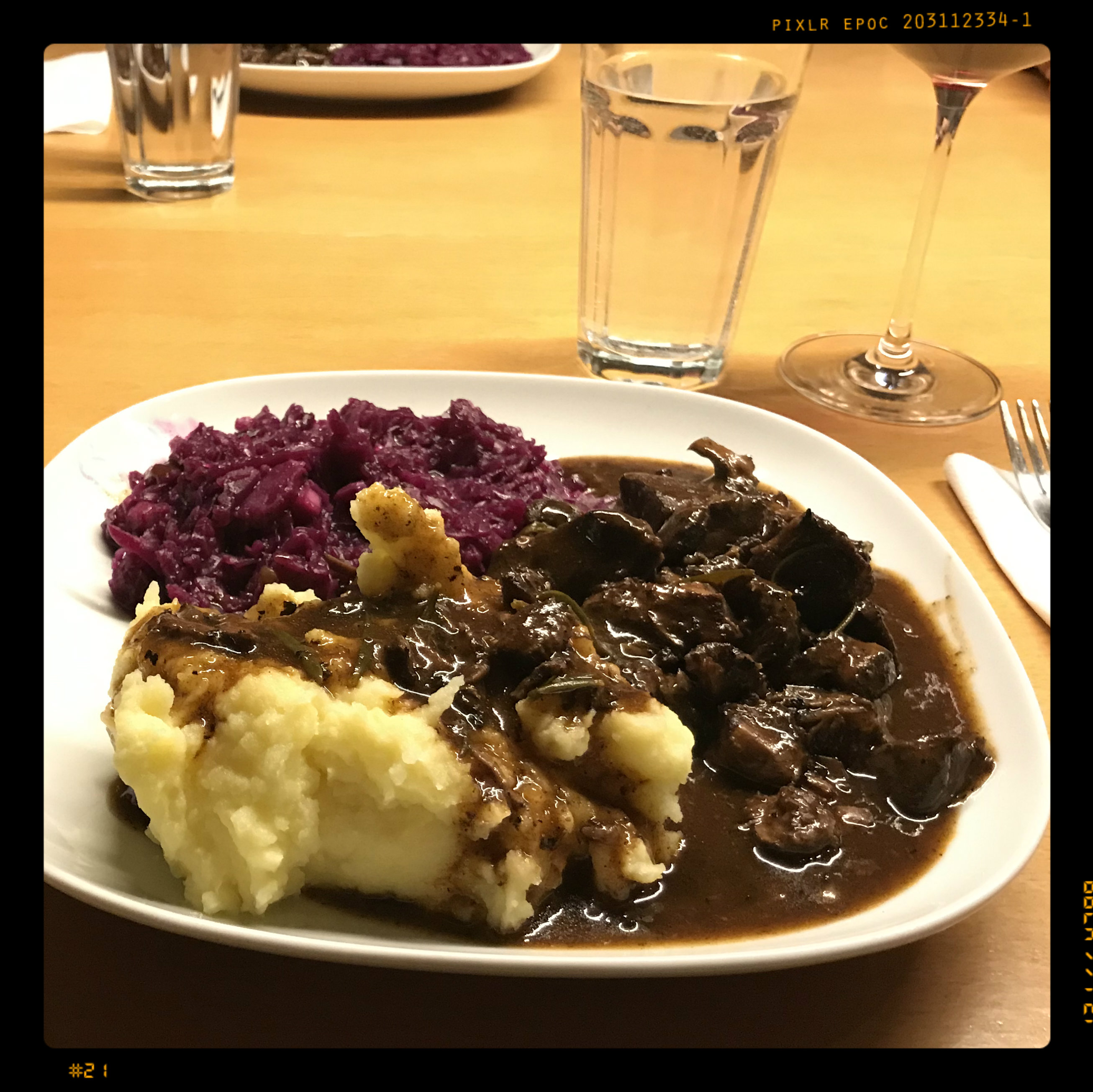 Rotkohl, Kartoffelpüree und Gulasch auf zwei vorgewärmten Tellern anrichten