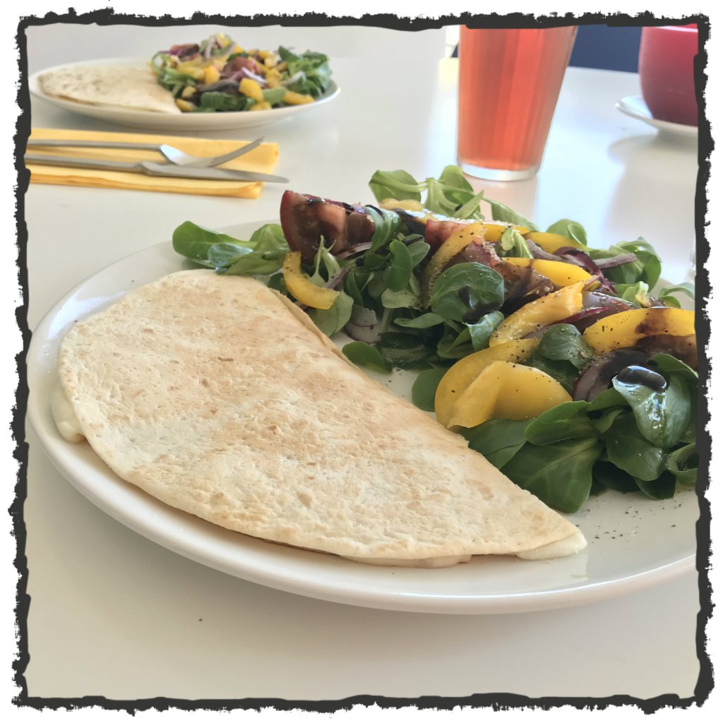etwas Olivenöl gefetteten beschichteten Pfanne mit Deckel bei mittlerer (oder etwas schwächerer) Hitze von jeder Seite etwa 3 Min. erwärmen, bis der Käse zerlaufen ist, die Tortilla sollte dabei nicht braun werden