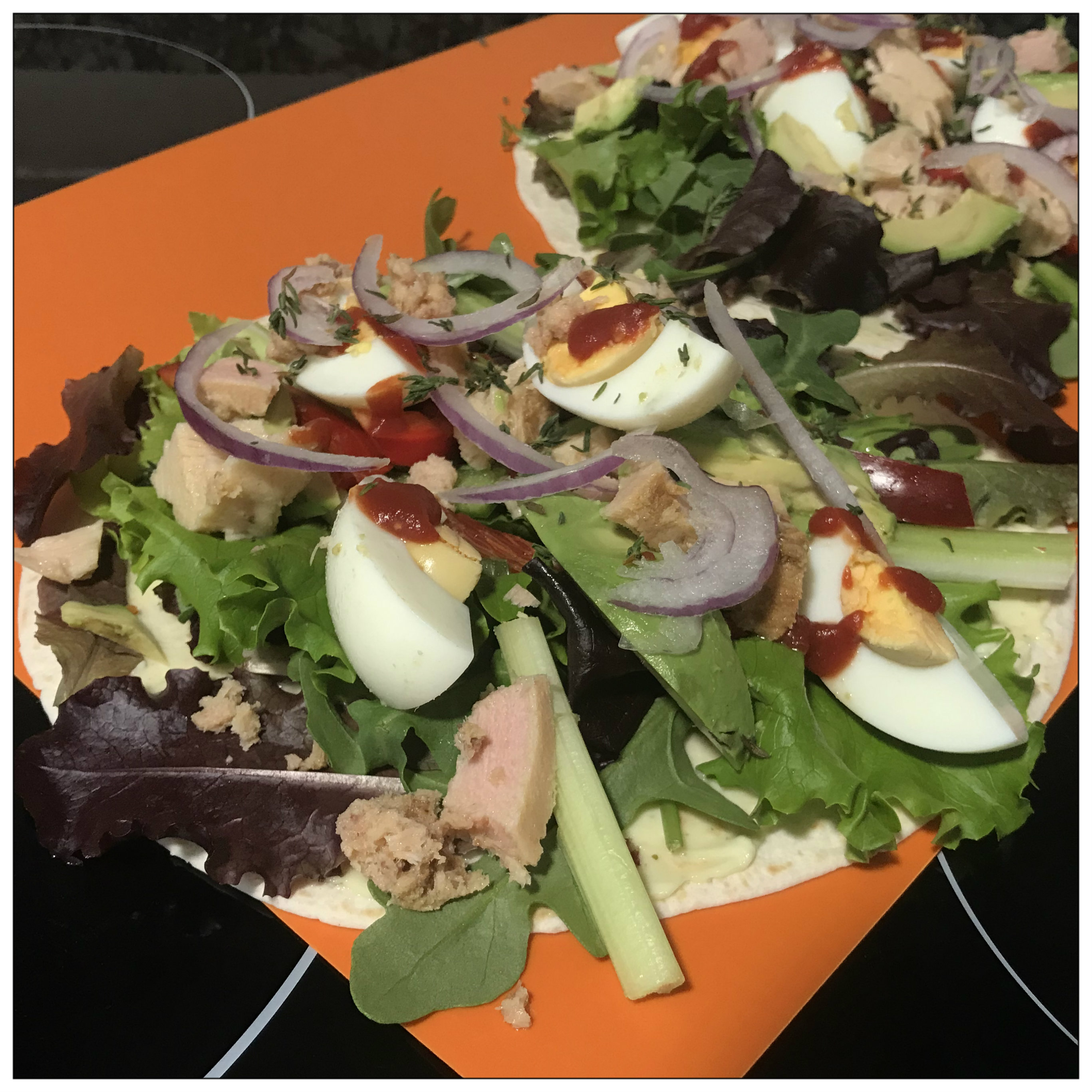 35 g Bonito (in Olivenöl – abgetropft, ersatzweise Tunfisch), dem längs geviertelten Ei,