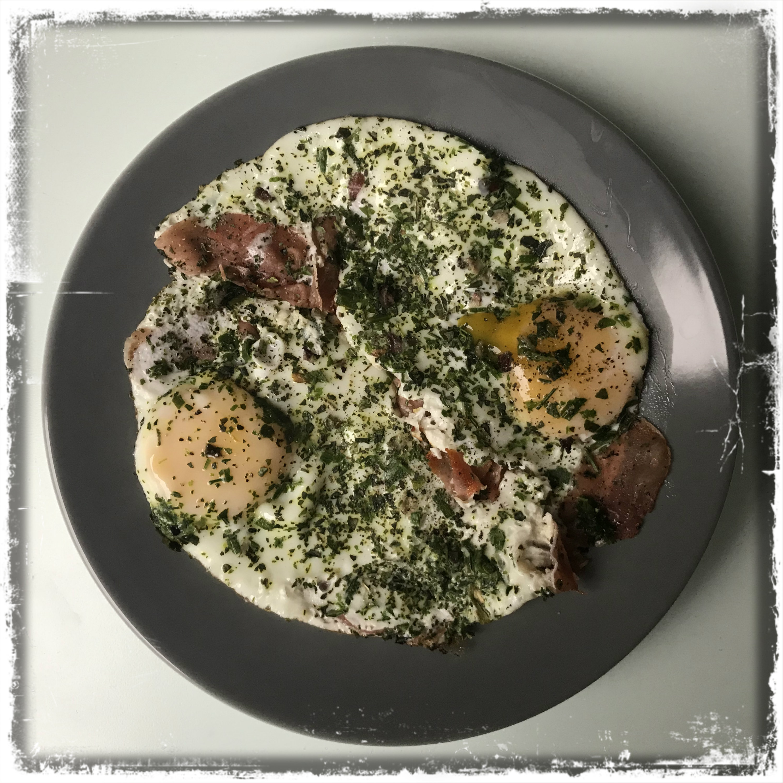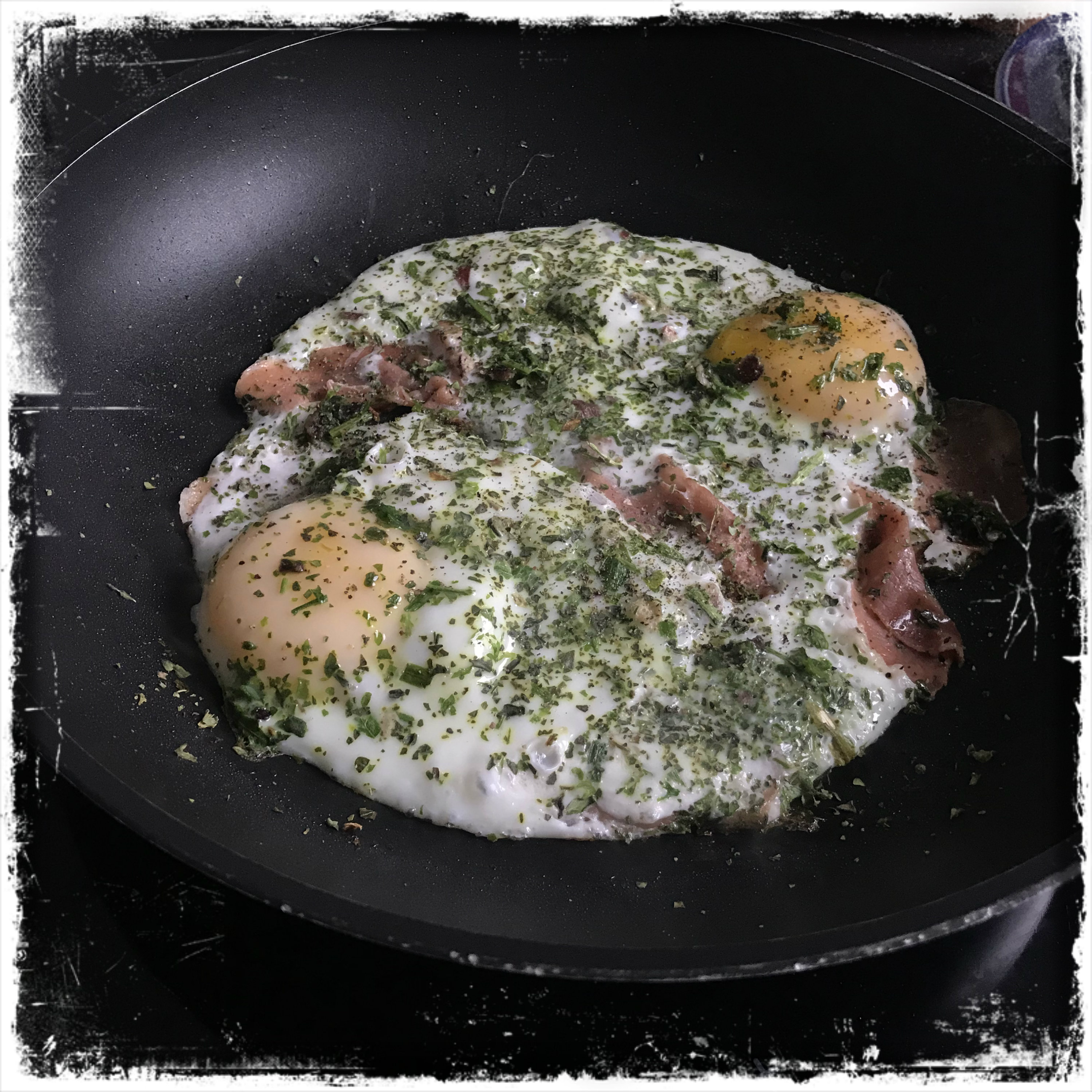 2 Eier (L) darauf aufschlagen und die Pfanne mit dem Deckel schließen, wenn die Eier die Konsistenz haben, die man möchte (ich mag das Eigelb noch weich), die Eier mit
