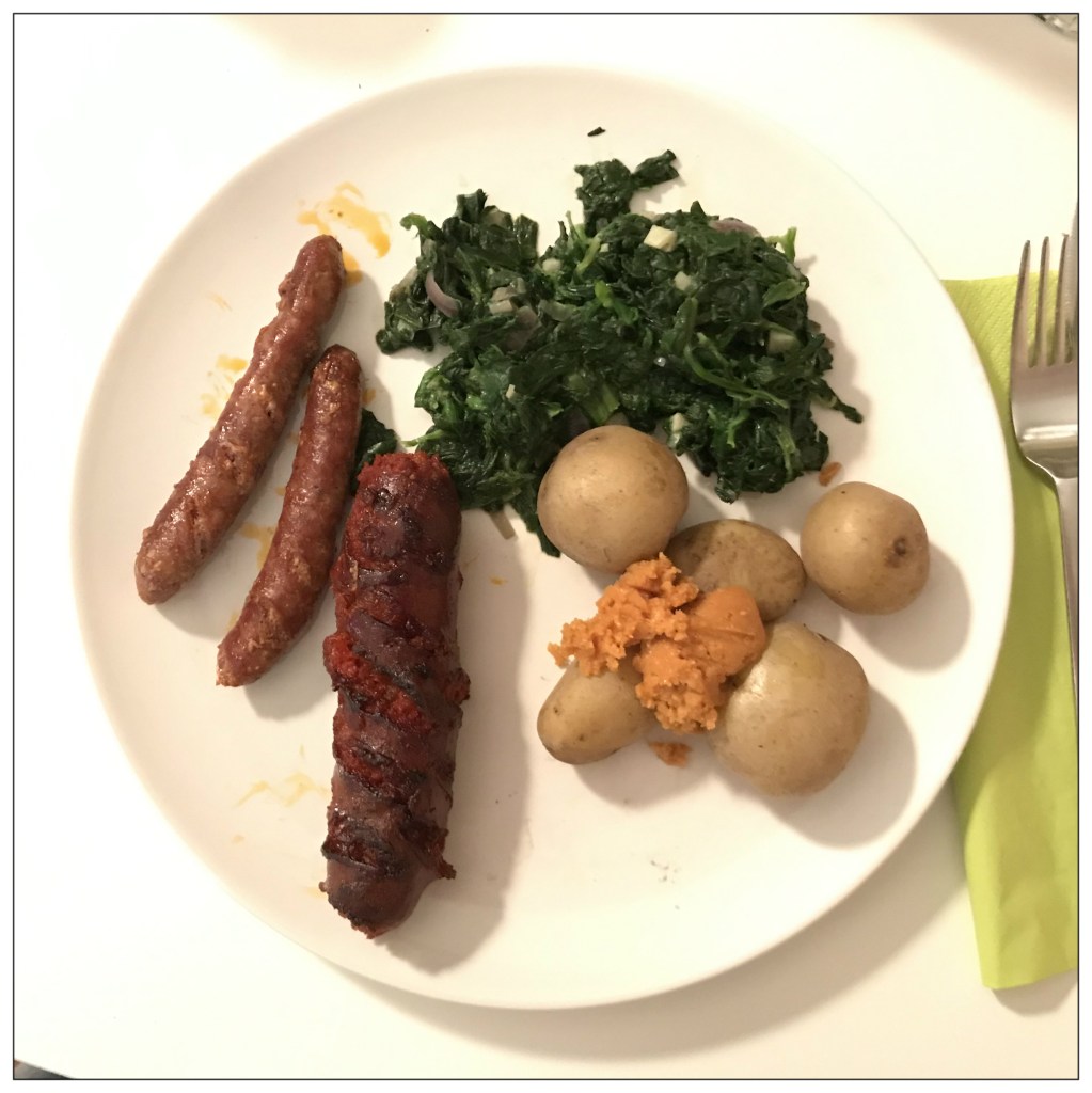 Küchenkrepp vom überschüssigen Fett befreien und mit Spinat und Kartoffeln auf zwei vorgewärmten Tellern verteilen und mit