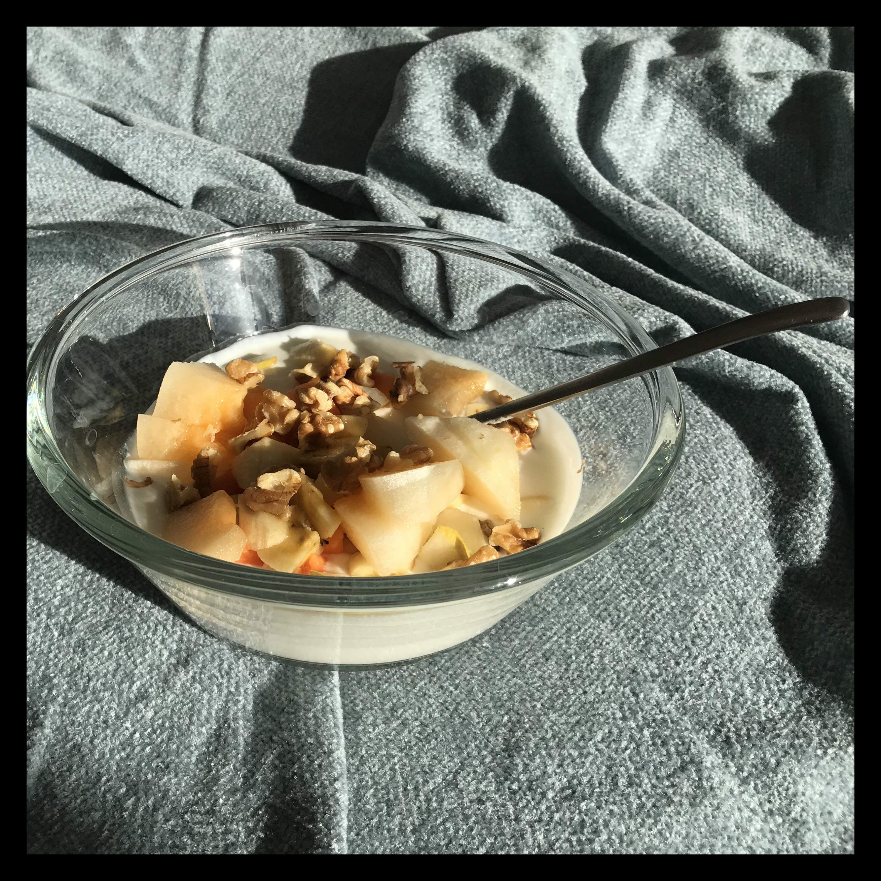 1/4 kl. Honigmelone in kleine Stücke schneiden und auf die Joghurtportionen aufteilen, beide Portionen mit insgesamt