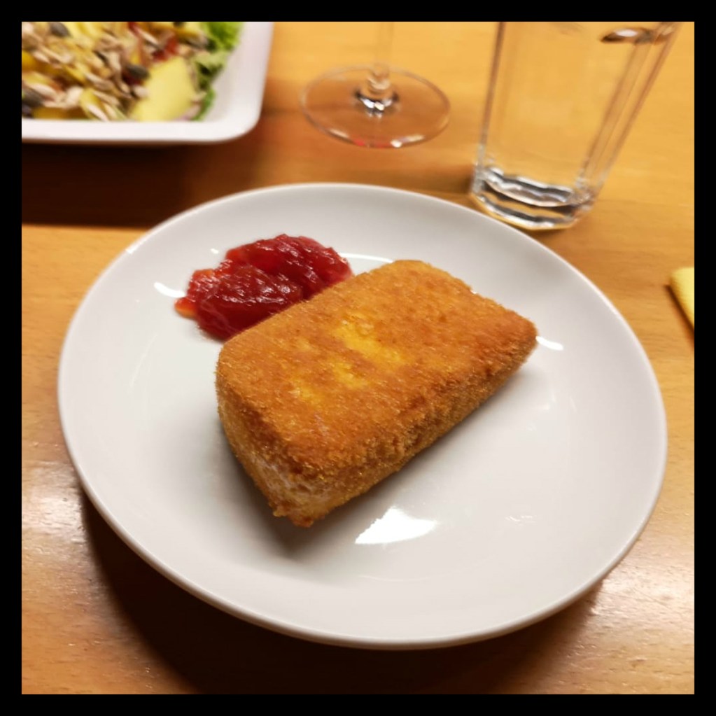 Maispaniermehl wälzen und dann in das heiße Öl gleiten lassen, dreimal nach je ca. 1 Min. wenden und noch ca. 1 Min. frittieren, dass die Panade goldbraun wird, aber noch kein Käse aus der Panade herauskocht
