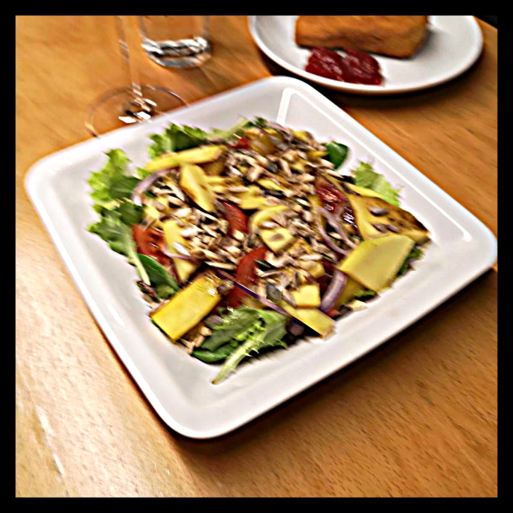 1/2 Mango (in kleine dünne Stücke geschnitten) auf zwei Tellern verteilen und mit einem Dressing aus