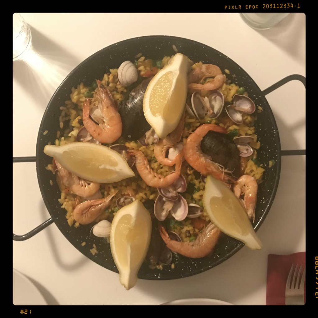 die Paella vor dem Essen mit etwas Zitronensaft beträufeln