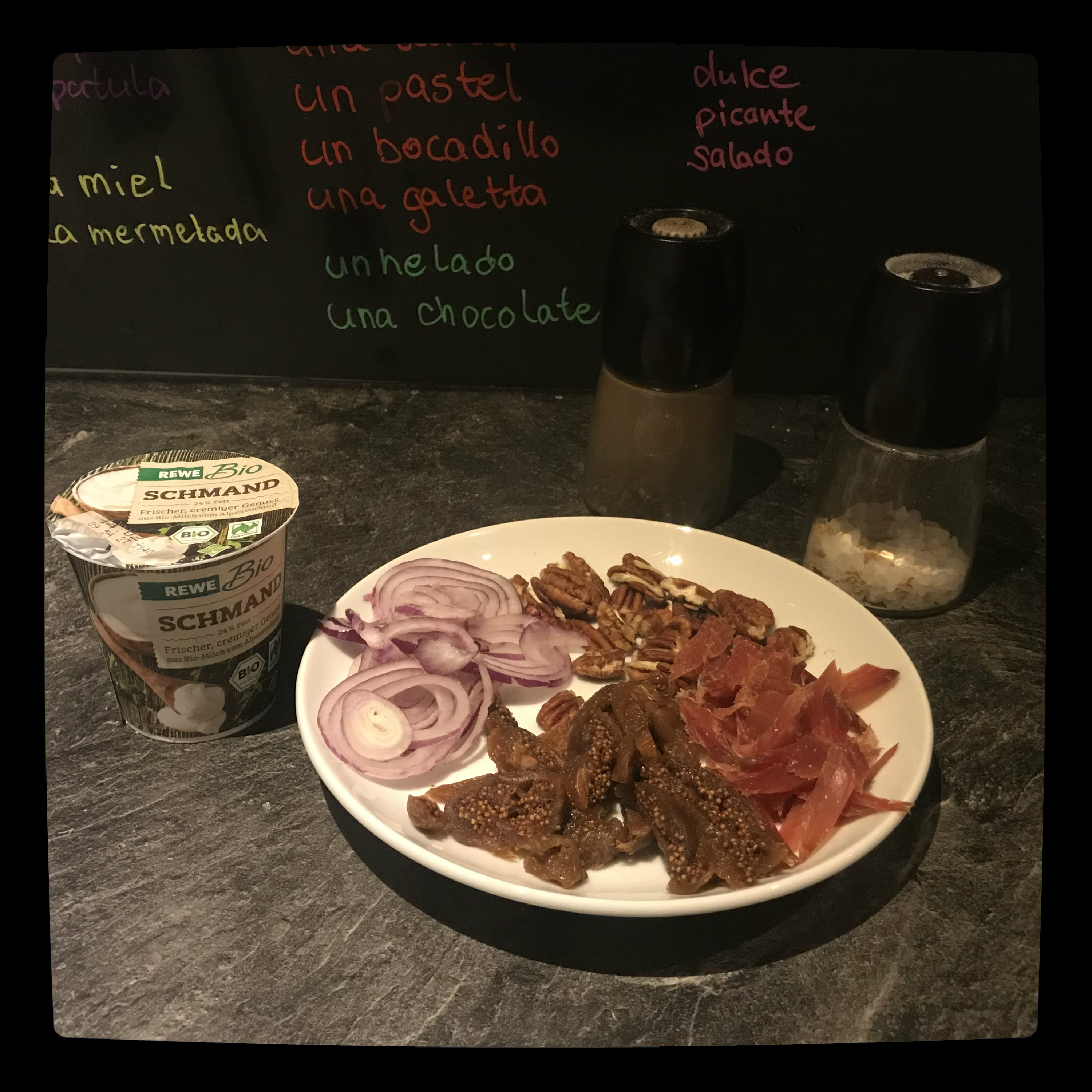 100 g Schmand bestreichen, Zwiebeln, Feigen und Schafsbrie auf dem Teig verteilen und mit