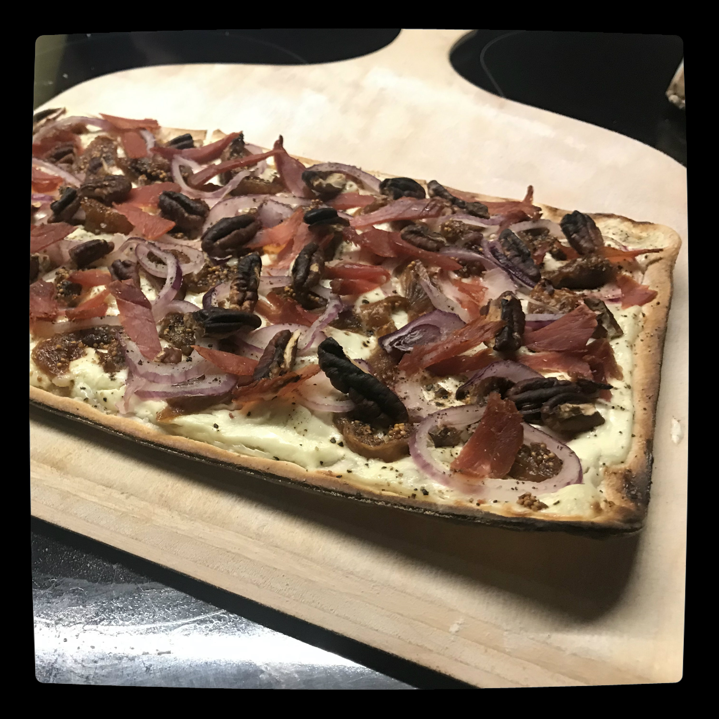 den Flammkuchen auf den Stein gleiten lassen und ca. 4 – 6 Min. (je nach Temperatur) backen (alternativ auf Backpapier ca. 10 Min.)