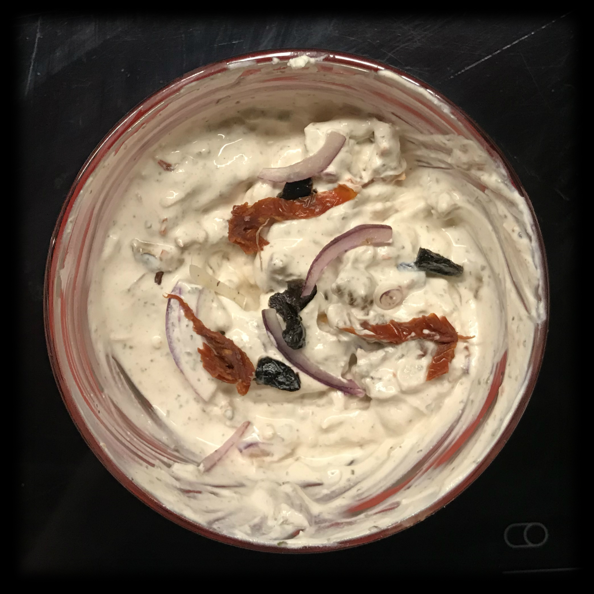 1/2 TL Paprikapulver (mild) verrühren, Knoblauch, Tomaten, Oliven und Zwiebeln unterrühren und mit