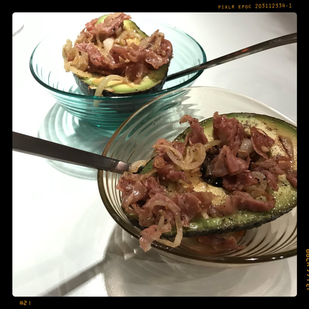1 Schalotte (in dünne Ringe geschnitten) hinzufügen und unter dem Deckel noch ca. 5 Min. schmoren, dann die Schinkenmischung auf die Avocados geben und servieren