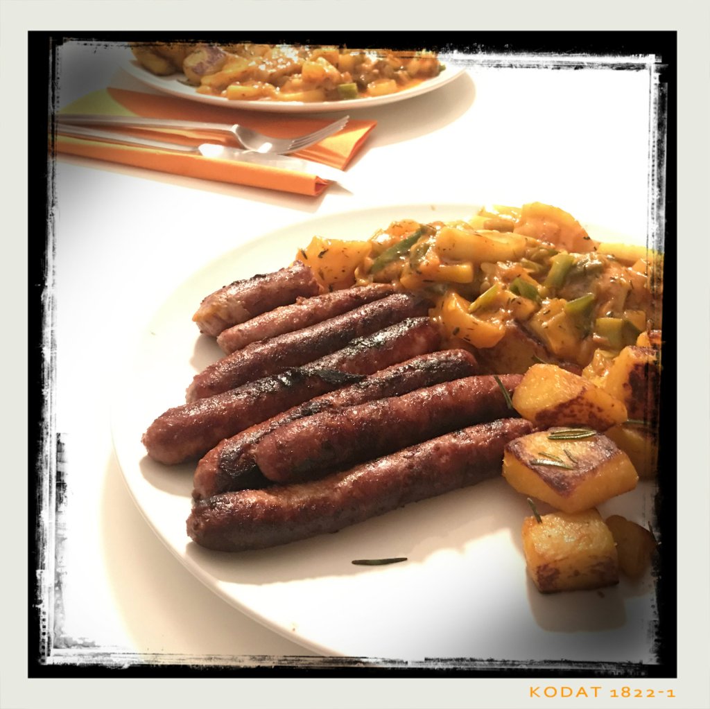 500 g Salchicha-Bratwürste mehrfach schräg einritzen und ca. 5 Min. bei mittelstarker Hitze in