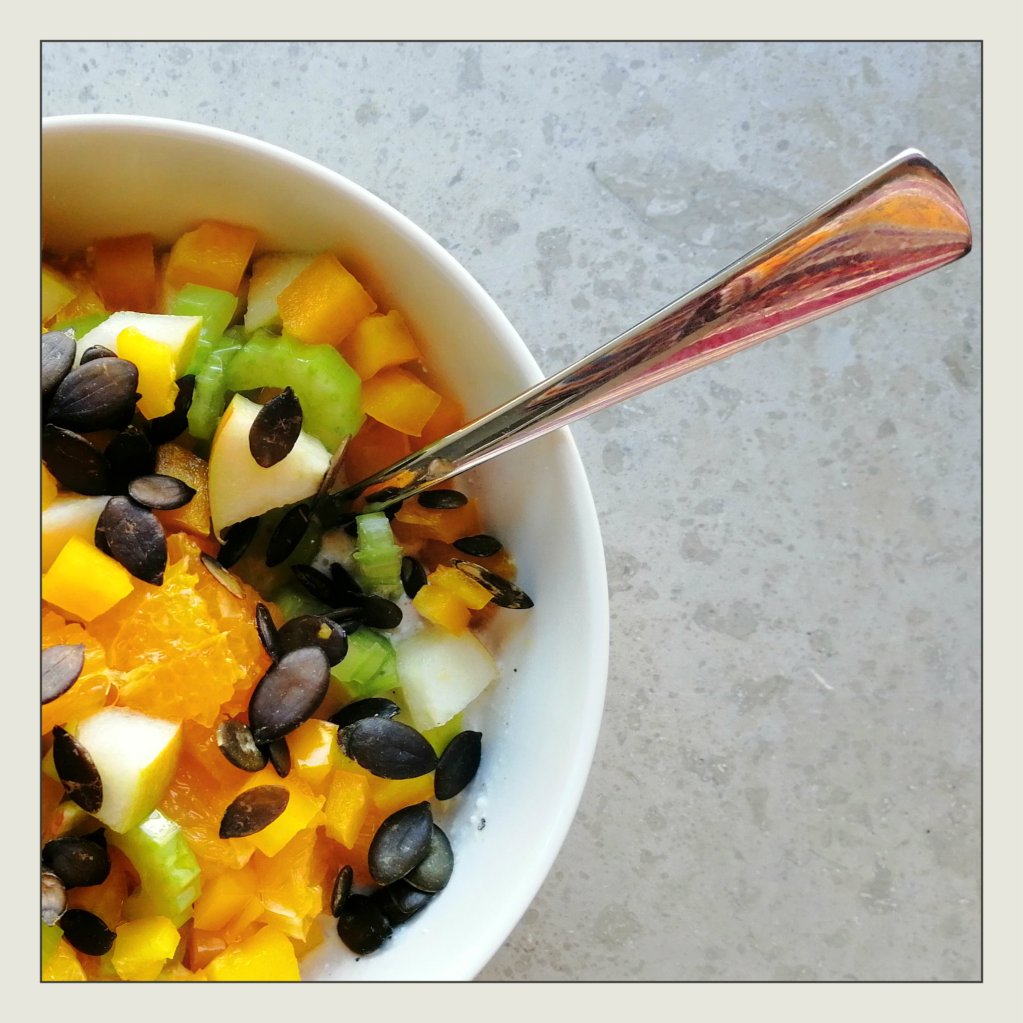 1 kl. Stange Staudensellerie (in Scheiben geschnitten) darauf verteilen, mit