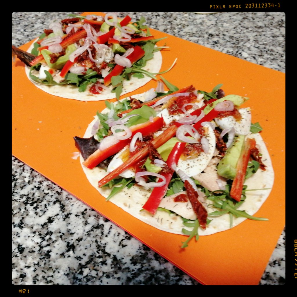 2 Handvoll Rucola-Salatblättern belegen, die Tortilla sollte damit komplett bedeckt sein, dann mit