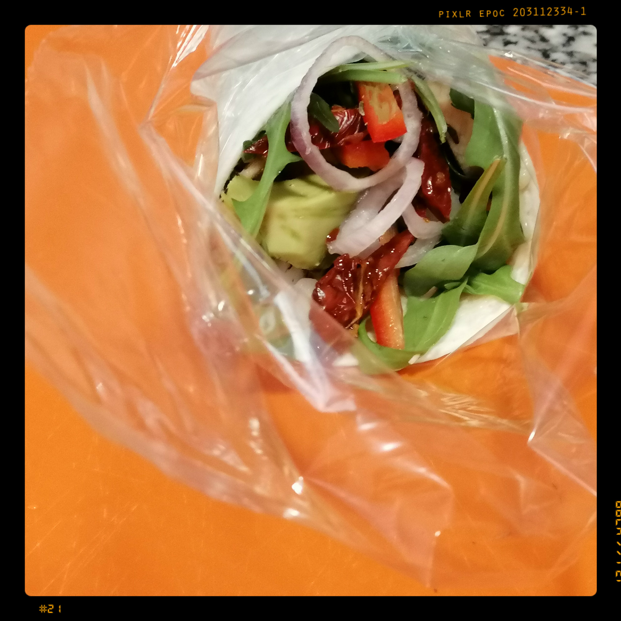 frisch gemahlenem schwarzen Pfeffer würzen, zu zwei Wrap fest zusammenrollen und in