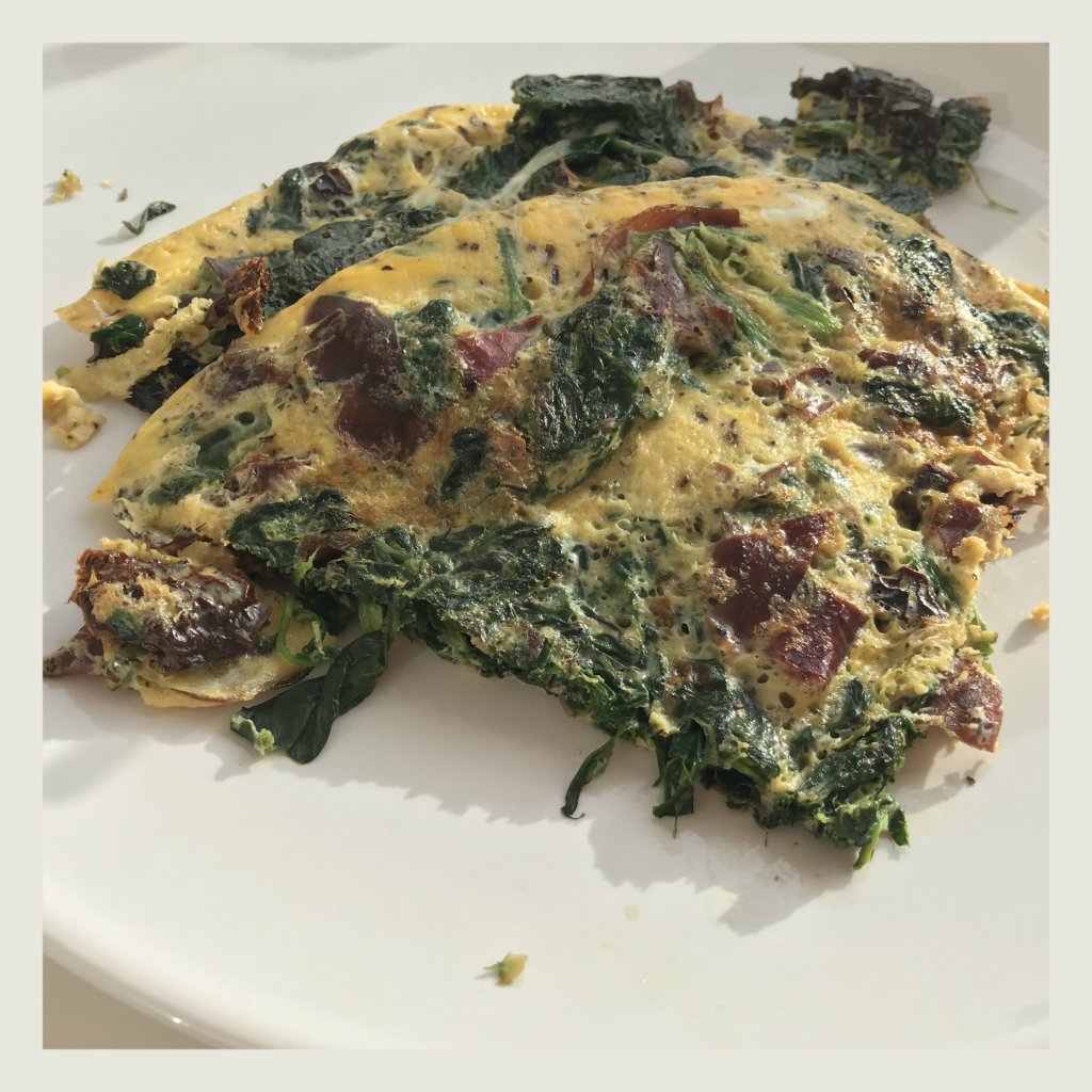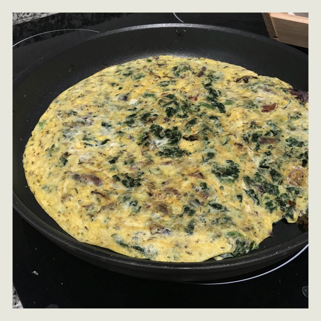 1 EL Bratolivenöl in der Pfanne verteilen und die Eimischung hineingeben, die Pfanne mit dem Deckel schließen und die Tortilla bei mittlerer Hitze in ca. 10 Min. stocken lassen, dann über den Deckel wenden und noch einmal ca. 3 Min. in der offenen Pfanne braten