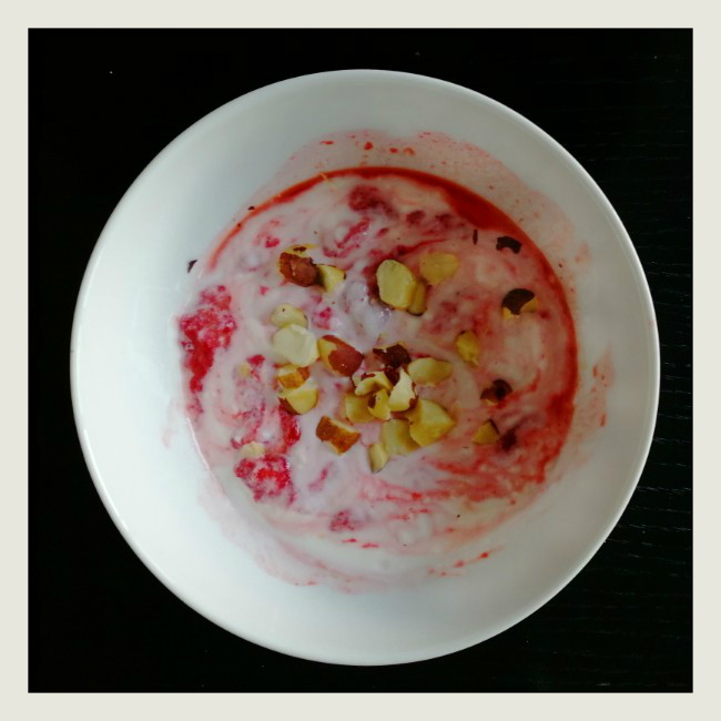 die Erdbeeren mit der Gabel zerdrücken und mit dem entstandenen Saft sowie
