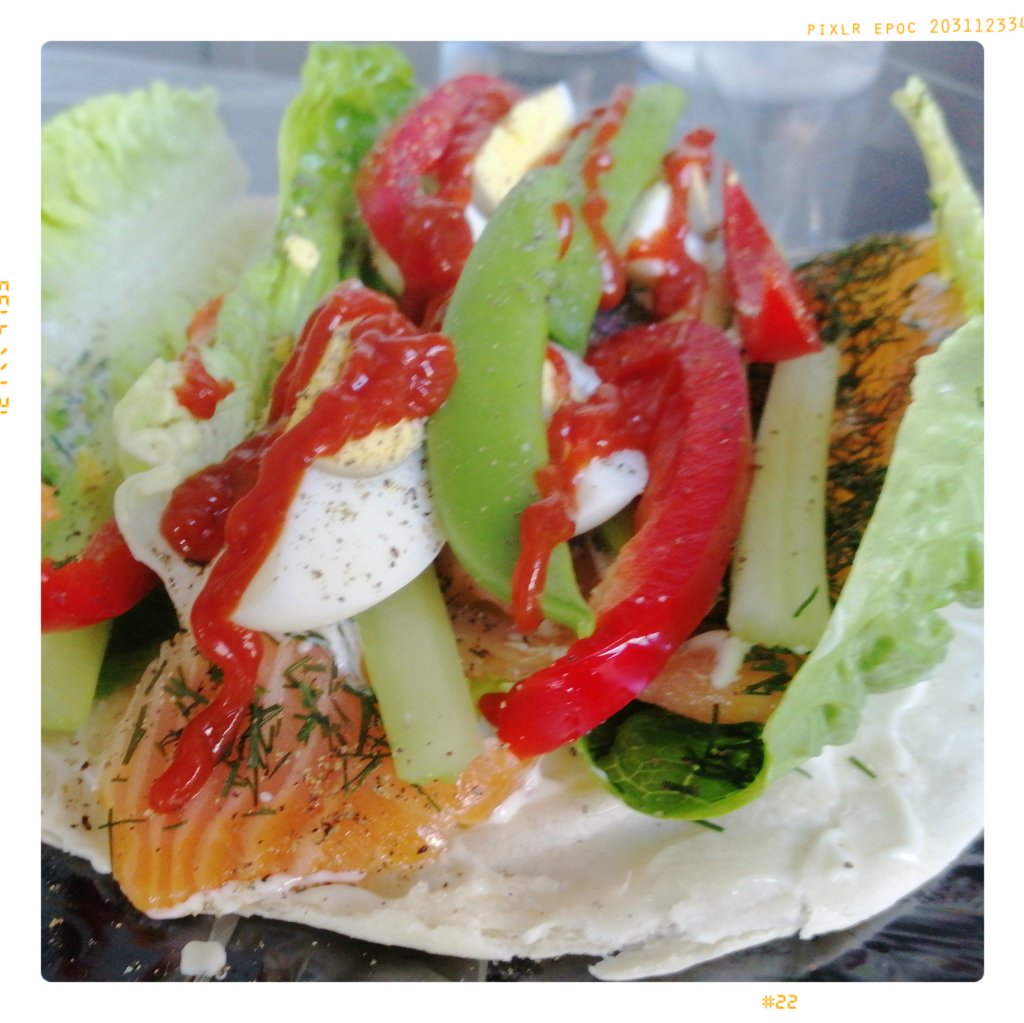 etwa 6 Blättern Mini-Romanasalat belegen, die Tortilla sollte damit komplett bedeckt sein, dann mit