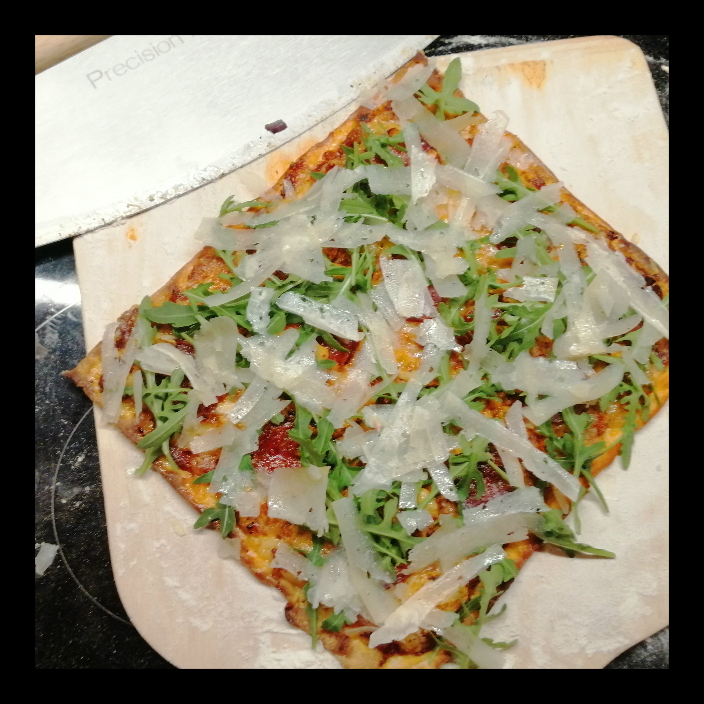 den Rucola auf der fertig gebackenen Pizza verteilen und den Manchego-Käse drüberstreuen
