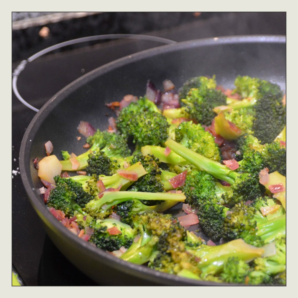 600 g Brokkoli (in Röschen geteilt, die Stiele geschält und in schmale Streifen geschnitten) zu der Zwiebelmischung hinzugeben und alles weitere ca. 15 Min. bei mittelschwacher Hitze dünsten, dabei ab und zu umrühren