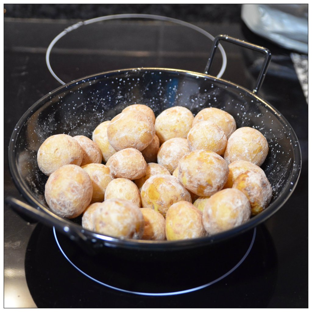 wenn die Kartoffeln gar sind, das Wasser vorsichtig abgießen, so dass das Salz erhalten bleibt und anschließend die Kartoffeln in ein hitzebeständige Schüssel oder einen anderen Topf umfüllen und unter ab und zu Schütteln auf bei schwacher Hitze auf dem Herd noch 30 Min. trocknen lassen, so dass sie eine leichte Salzkruste bekommen, derweil