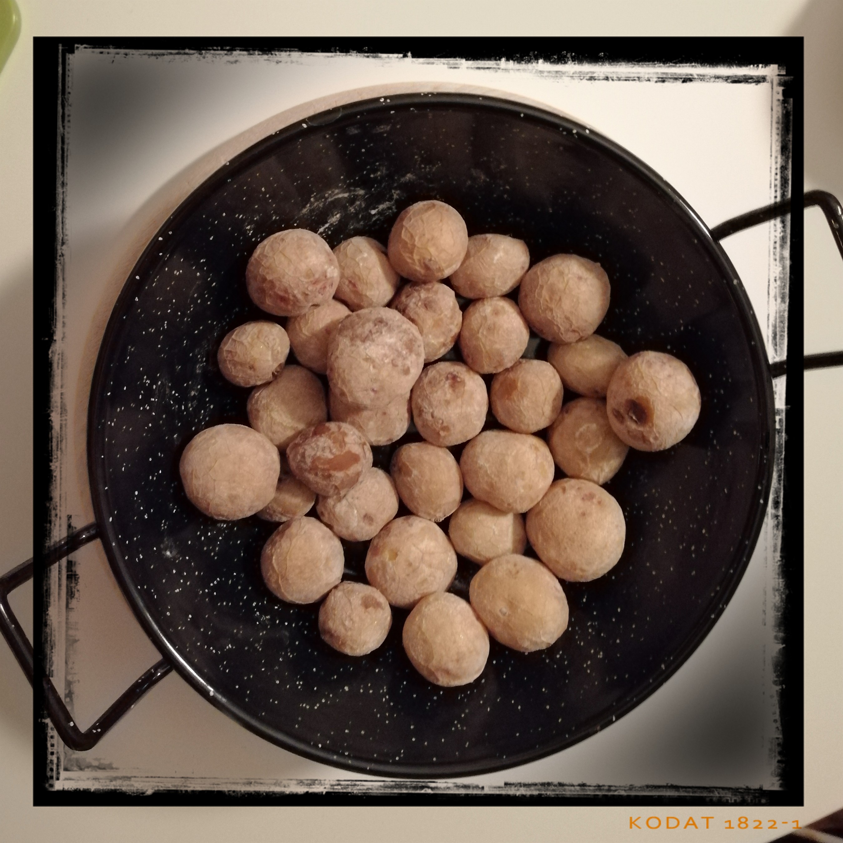 120 g grobes Meersalz hinzufügen und zum Kochen bringen, ca. 20 – 30 Min. – je nach Größe der Kartoffeln – bei mittelschwacher Hitze gar kochen, zwischendurch 2 – 4 mal den Topf mit den Kartoffeln leicht schwenken, dass sich das Salz verteilt, aber auf keinen Fall heftig bewegen oder gar umrühren, dann das Wasser vorsichtig abgießen, dass das Salz erhalten bleibt, anschließend die Kartoffeln in ein hitzebeständige Schüssel oder einen anderen Topf umfüllen und unter ab und zu Schütteln bei schwacher Hitze auf dem Herd oder im Backofen noch 30 Min. trocknen lassen, so dass sie eine leichte Salzkruste bekommen