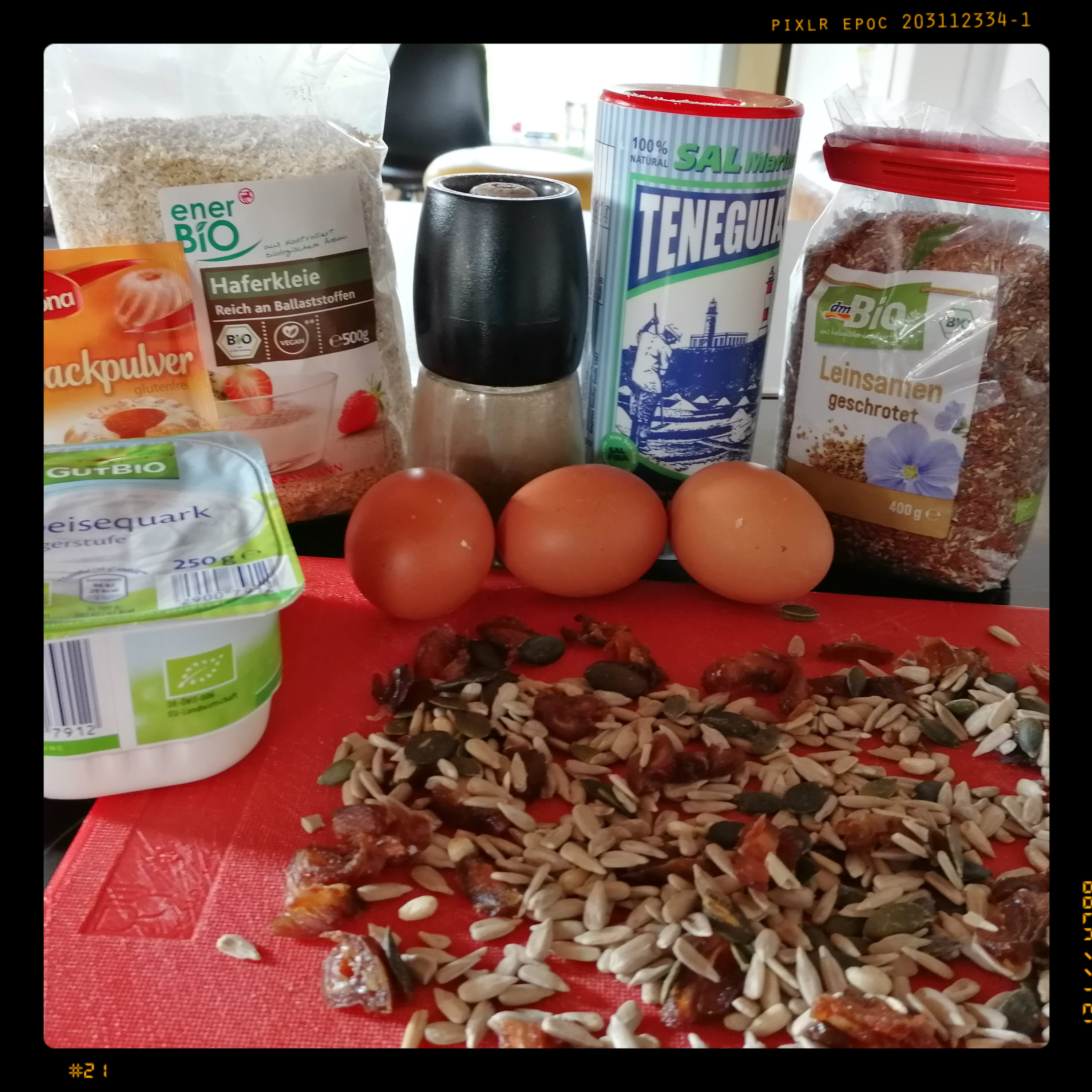 45 g Salatkernemischung (aus Sonnenblumen-, Kürbis- und Pinienkernen) unter die Teigmasse mischen, aus dem Teig 12 Brötchen formen und auf