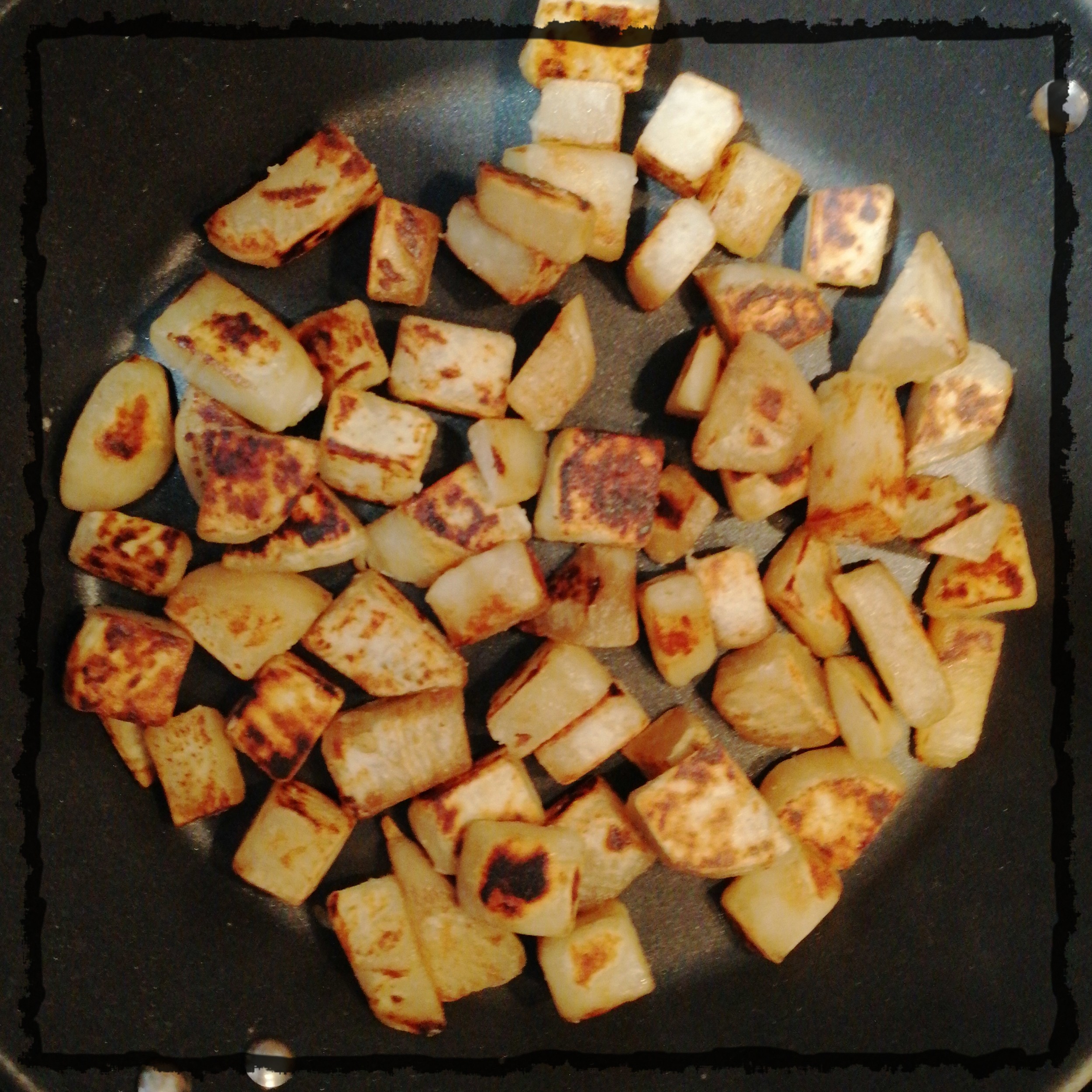 Salz zu den Batate-Stücken geben und diese ohne Deckel noch ca. 5 Min. unter häufigem Wenden weiter braten