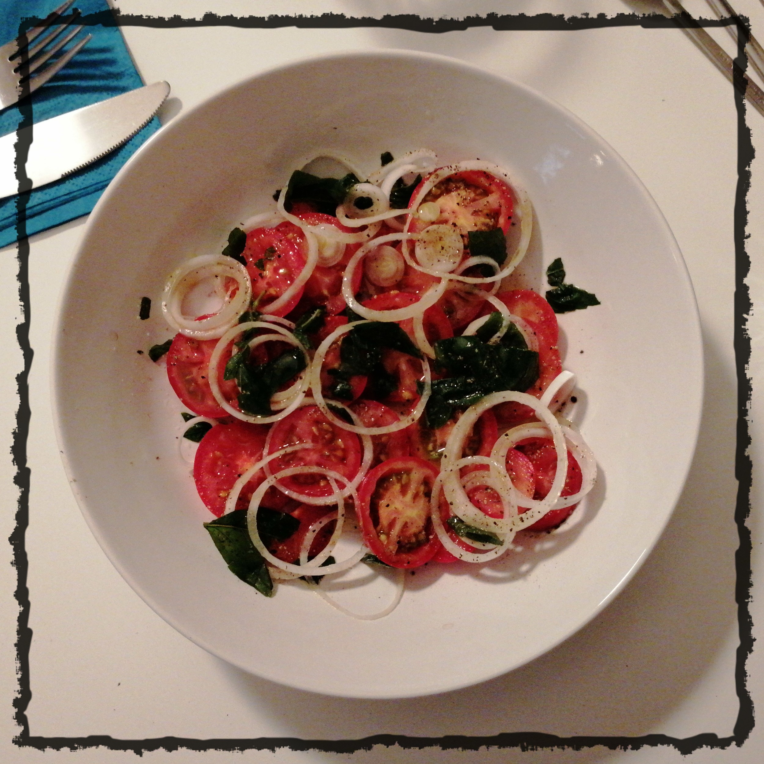 frisch gemahlenem schwarzen Pfeffer zwei Portionen Tomatensalat zubereiten