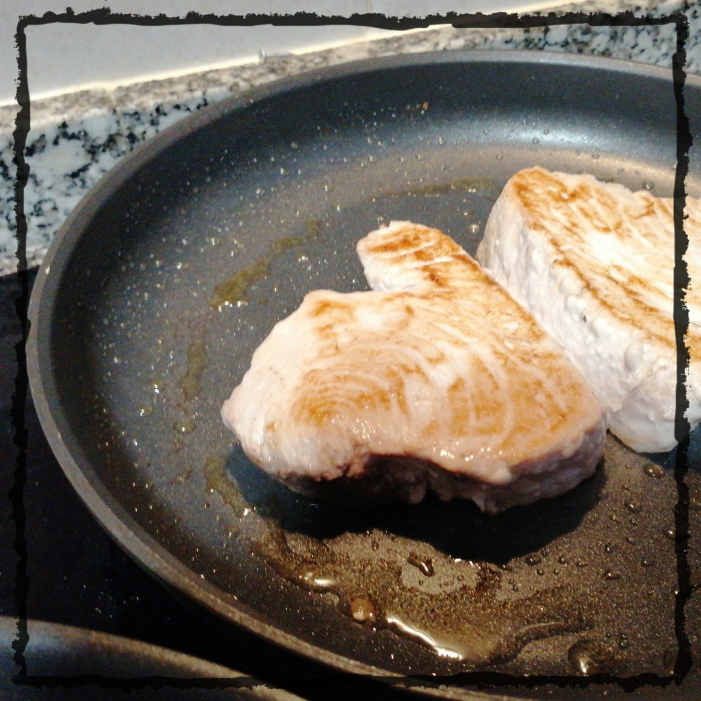 2 EL Brat-Olivenöl bei mittelstarker Hitze in eine Pfanne von beiden Seiten braten, das dauert je nach Dicke und gewünschtem Gargrad ca. 6 – 10 Minuten,