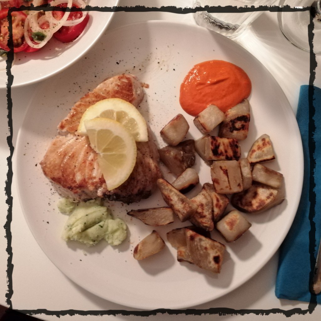die Tunfischsteaks mit den Batatestücken auf zwei vorgewärmte Teller geben, die Zitronenscheiben auf die Steaks geben, und alles mit dem Tomatensalat und ggf. kanarischer Ziegenkäsecreme und Mojo servieren
