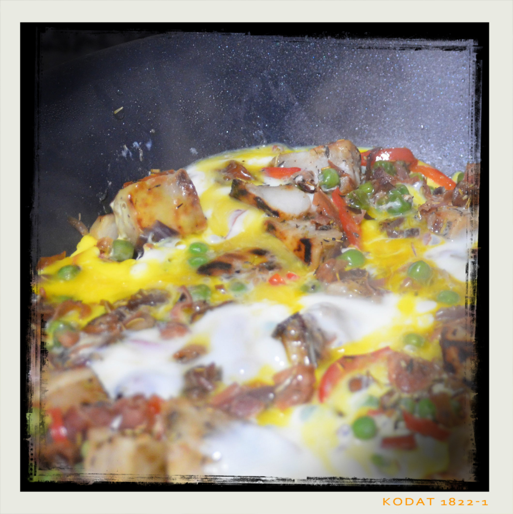 6 Eier (mögl. L) aufschlagen und aus größerer Höhe auf die Kartoffelmischung fallen lassen, ggf. verteilen und unter dem Deckel in ca. 3 Min. stocken lassen,