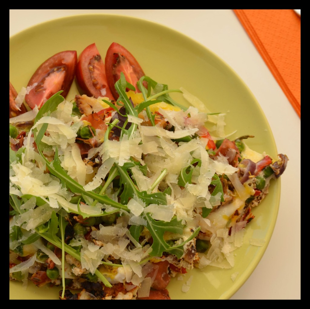 1 EL Brat-Olivenöl darin mittelstark erhitzen, die Batatestücken mit dem Schinken in die Pfanne geben, kurz anbraten, dann die Gemüsemischung dazugeben, mit