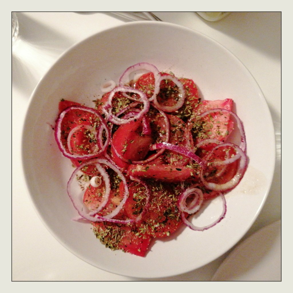 450 g große gerippte Fleischtomaten in dünne Spalten schneiden und auf zwei Tellern anrichten, mit 1/2 roten Zwiebel (in feine Ringe geschnitten) belegen und mit