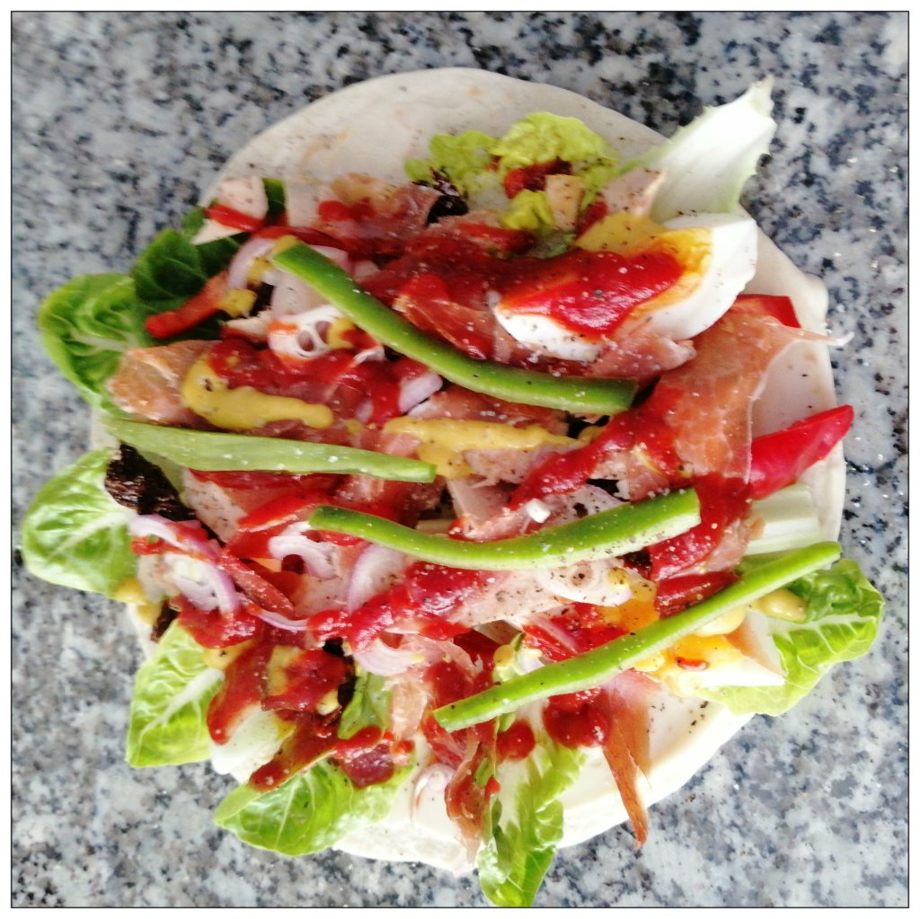 etwa 8 Blättern Mini-Romanasalat (je nach Größe) belegen, die Tortilla sollte damit komplett bedeckt sein, dann mit