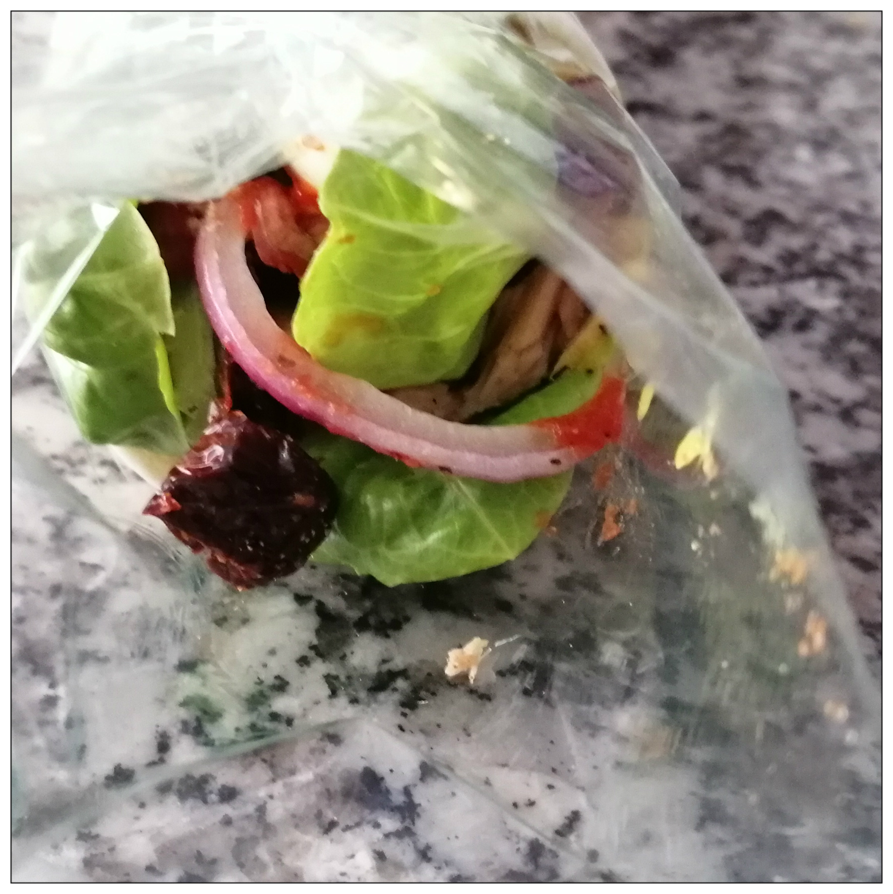 etwa 8 Blättern Mini-Romanasalat (je nach Größe) belegen, die Tortilla sollte damit komplett bedeckt sein, dann mit