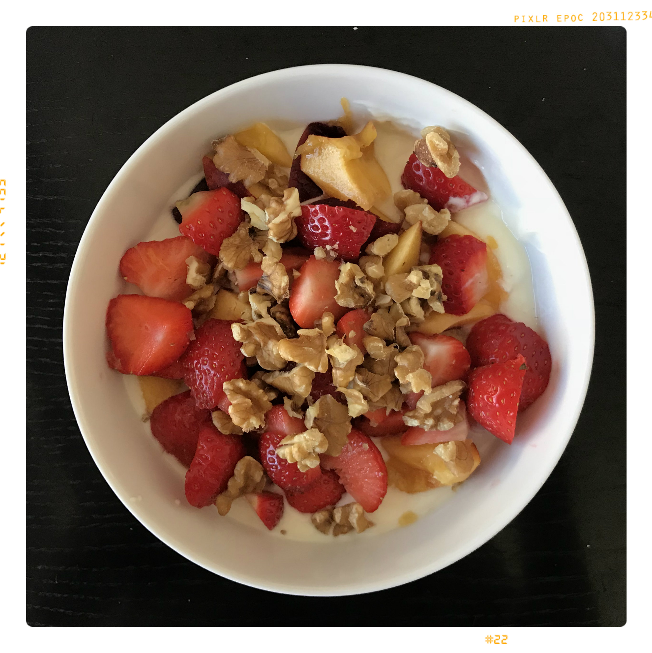 150 g Erdbeeren (geviertelt), auf dem Joghurt verteilen, dann mit