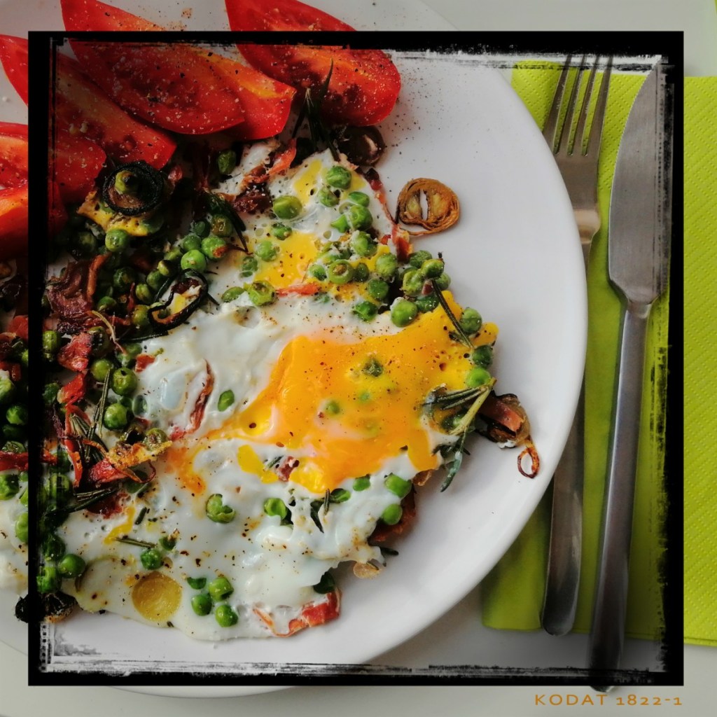 frisch gemahlenem schwarzen Pfeffer würzen und die Pfanne sofort mit dem Deckel schließen, auf mittlere Hitze herunterschalten und ein paar Minuten garen, bis die Eier gestockt sind, z. B. mit frisch aufgeschnittener Roma-Tomate (gesalzen und gepfeffert) servieren