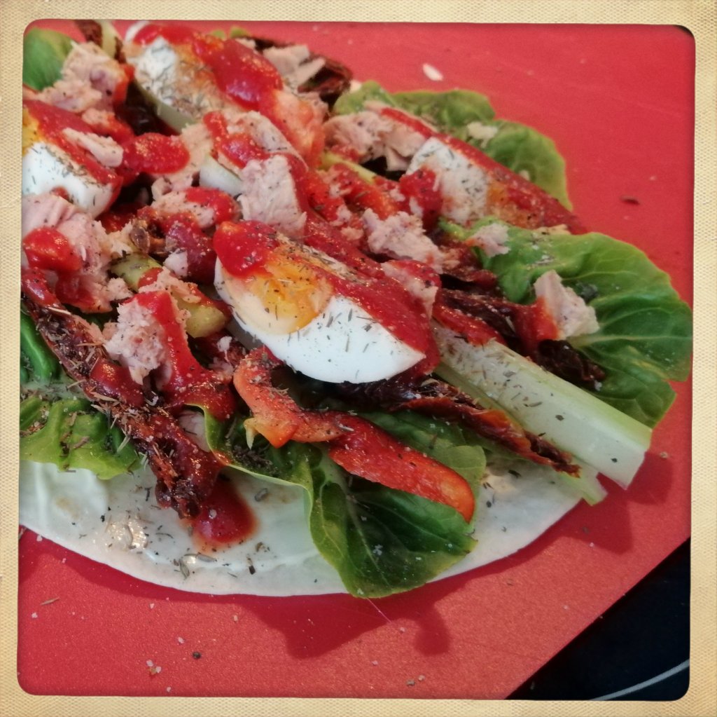 frisch gemahlenem schwarzen Pfeffer würzen, zu einem Wrap fest zusammenrollen und in