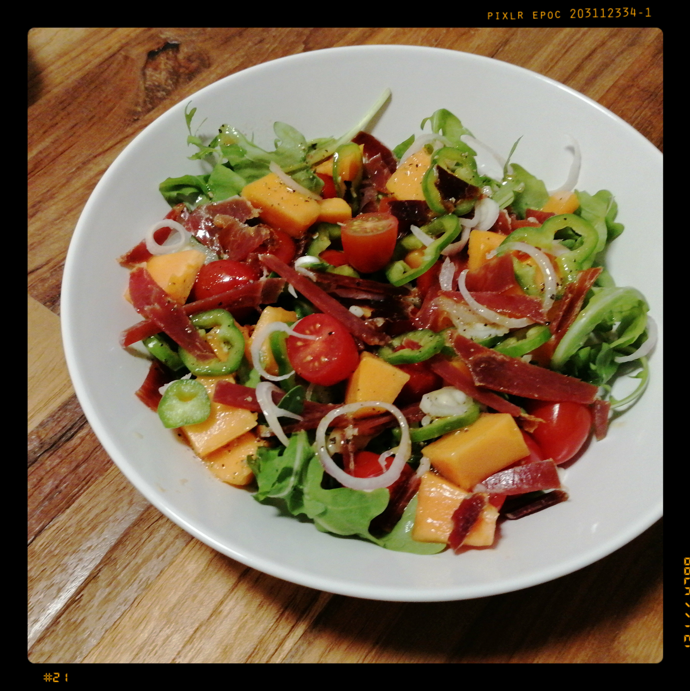 25 g Serrano-Schinken (in Streifen geschnitten) zu einem Salat mischen und