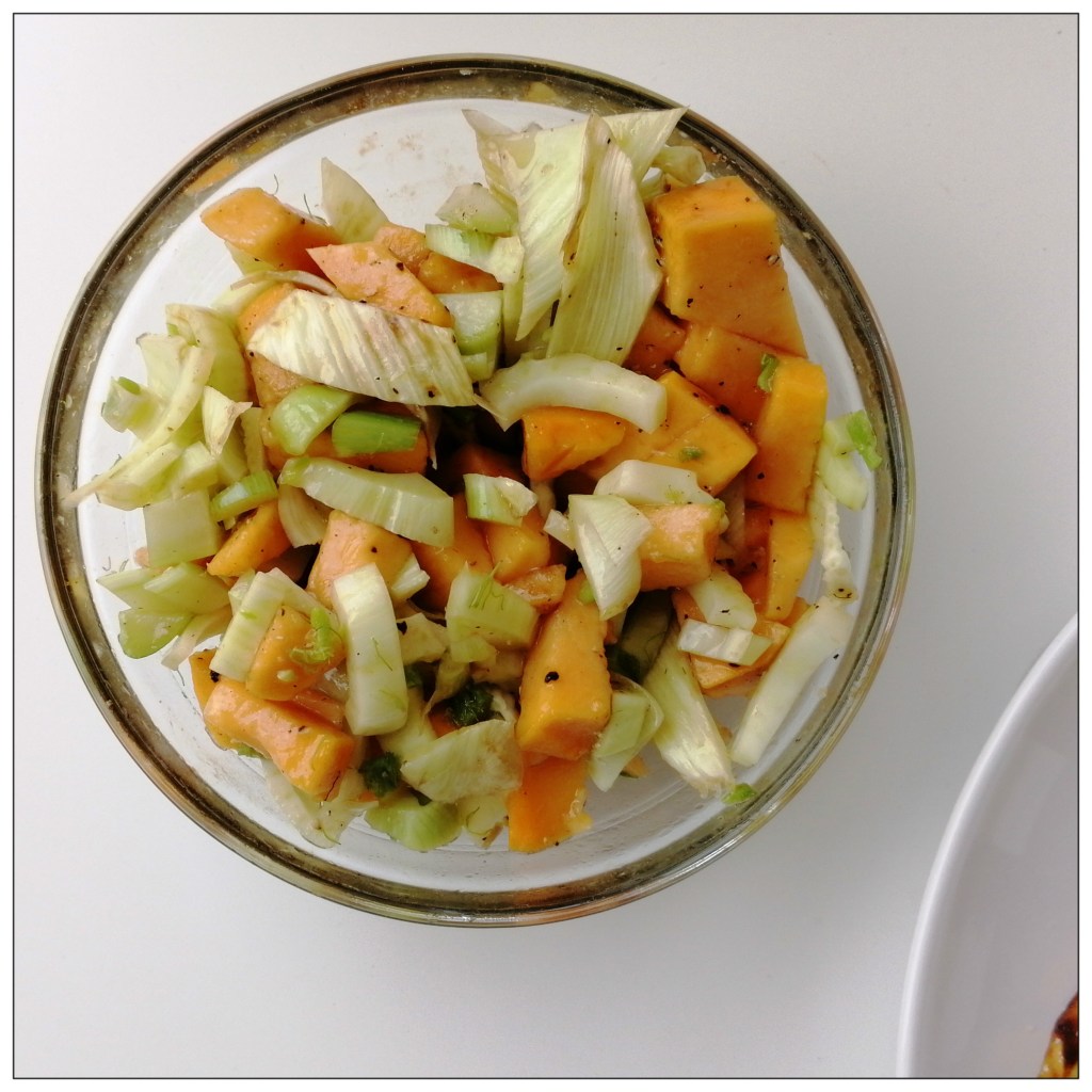 1 Mini-Fenchel (oder 1 halben normal großen) längs vierteln und in kurze Streifen schneiden,